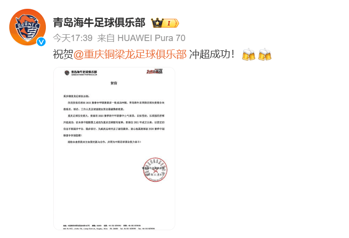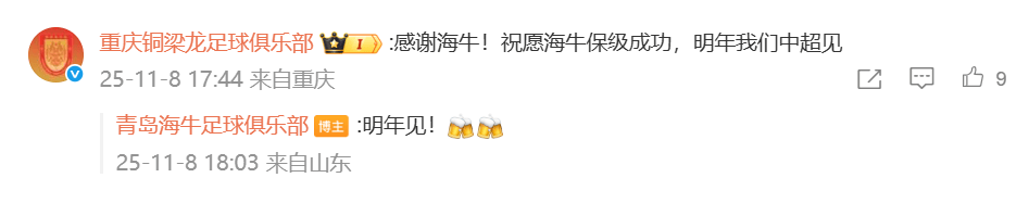 赛后,中超球队青岛海牛俱乐部官方发文祝贺青岛铜梁龙冲超成功。两支球队随后还在评论区友好互动,铜梁龙官博回帖祝愿海牛保级成功。