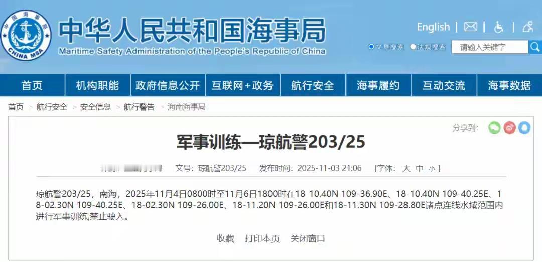 黄岩岛是我国的国家级自然保护区,因此三亚海事局发布航行警告,11月4日8时至6日18时,南海部分海域进行军事训练,禁止驶入。完全合情合理合法。 菲律宾近期连续3天连续出动飞机和舰船侵闯我黄岩岛领空领海,进行滋扰活动。我方则出动海军直直升机、空军战机以及军舰、海警船对其实施了驱离。 相信国家今后在黄岩岛划禁区开展军事活动将成为常态。我们更希望后续以这些“禁区”为依托,在黄岩岛开展填海造岛活动,更好开发保护我们的自然保护区。