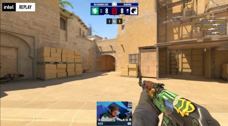 第16局Niko上局尾拿到AK,本局开场中路先杀狂哥,K3在A1击杀molodoy,Monesy电话亭大狙看A1,黑豹三人保枪,猎鹰8-8黑豹。
