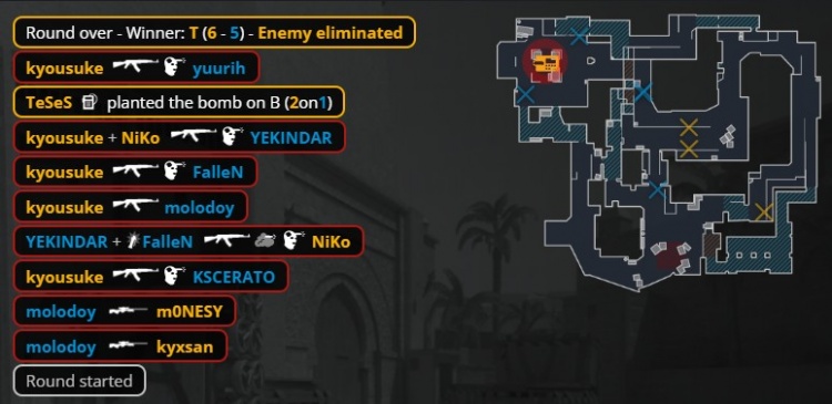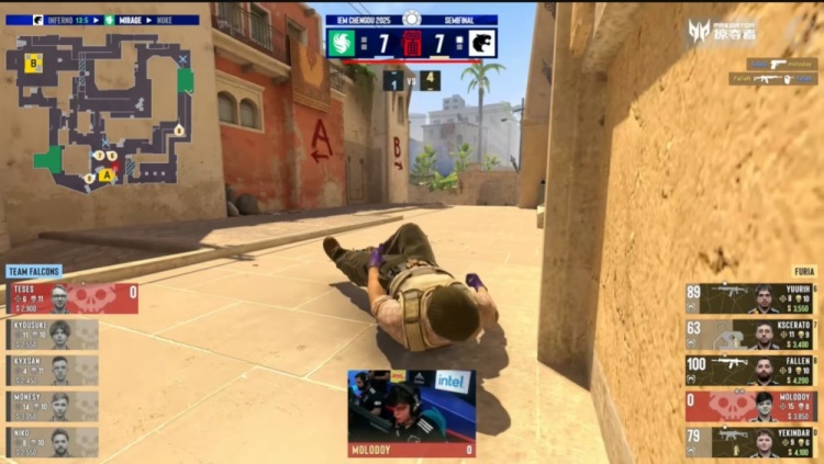 第12局molodoy大狙继续来中找下水道Monesy,但Monesy大狙带包在匪二楼等队友信息,随后猎鹰四人带包A二楼夹A,京介从B二楼撤退,Monesy大狙进A1击杀电话亭的molodoy,yuurih包点双杀但被Niko击杀,京介拱门狂杀卡神与狂哥,Monesy再轰掉教父,猎鹰7-5黑豹。