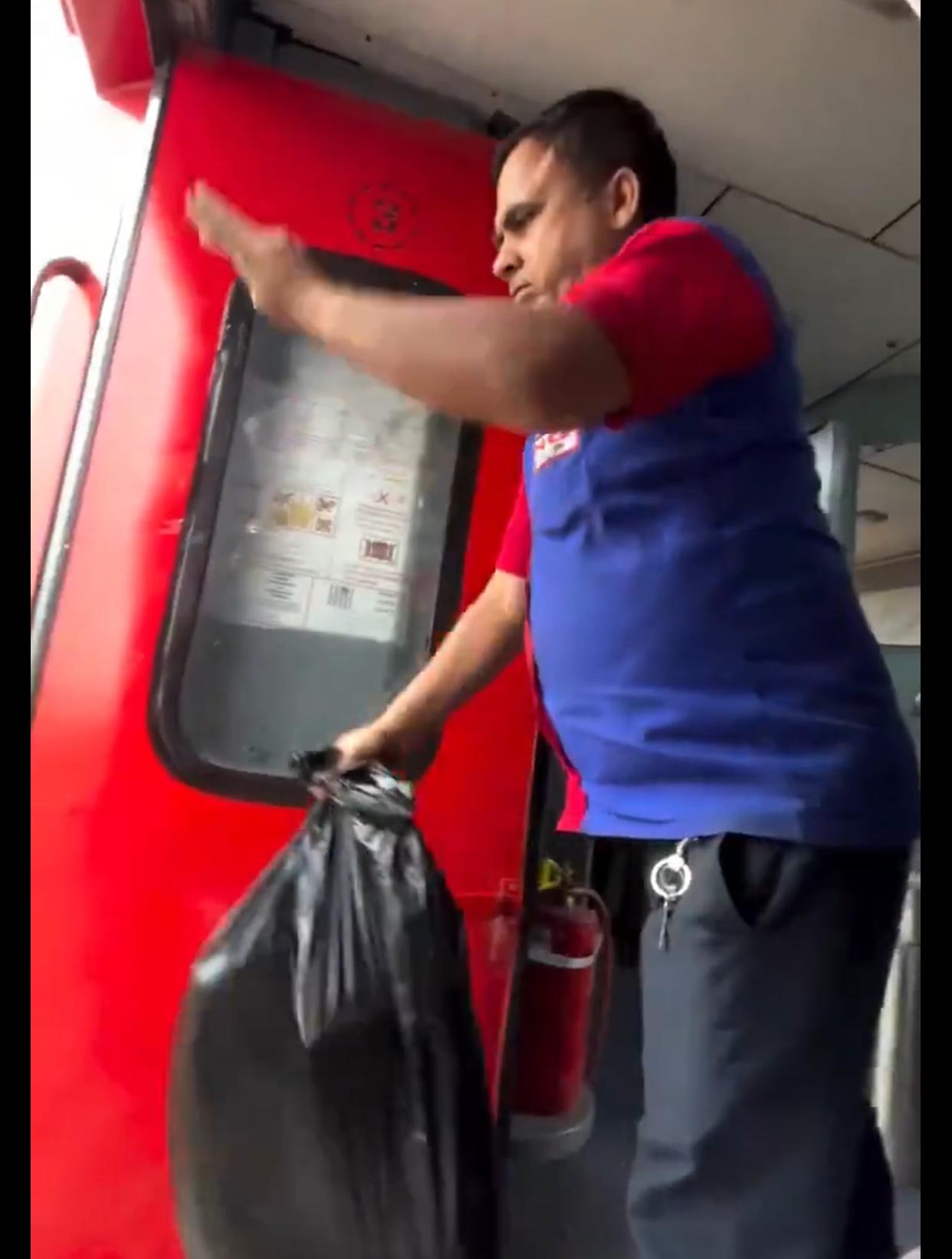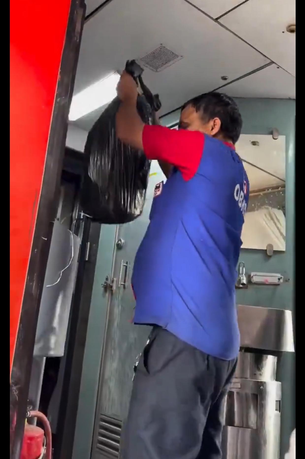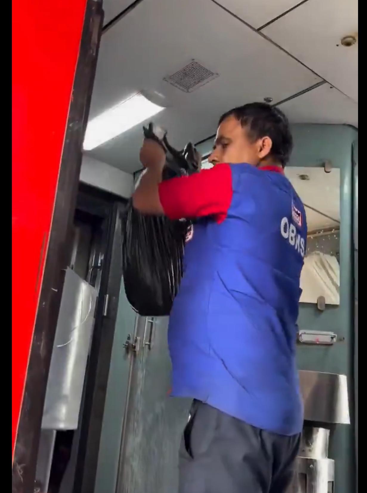 印度火车上的卫生工作人员处理火车上垃圾的方式,是直接把垃圾包在一个黑色塑料袋里,