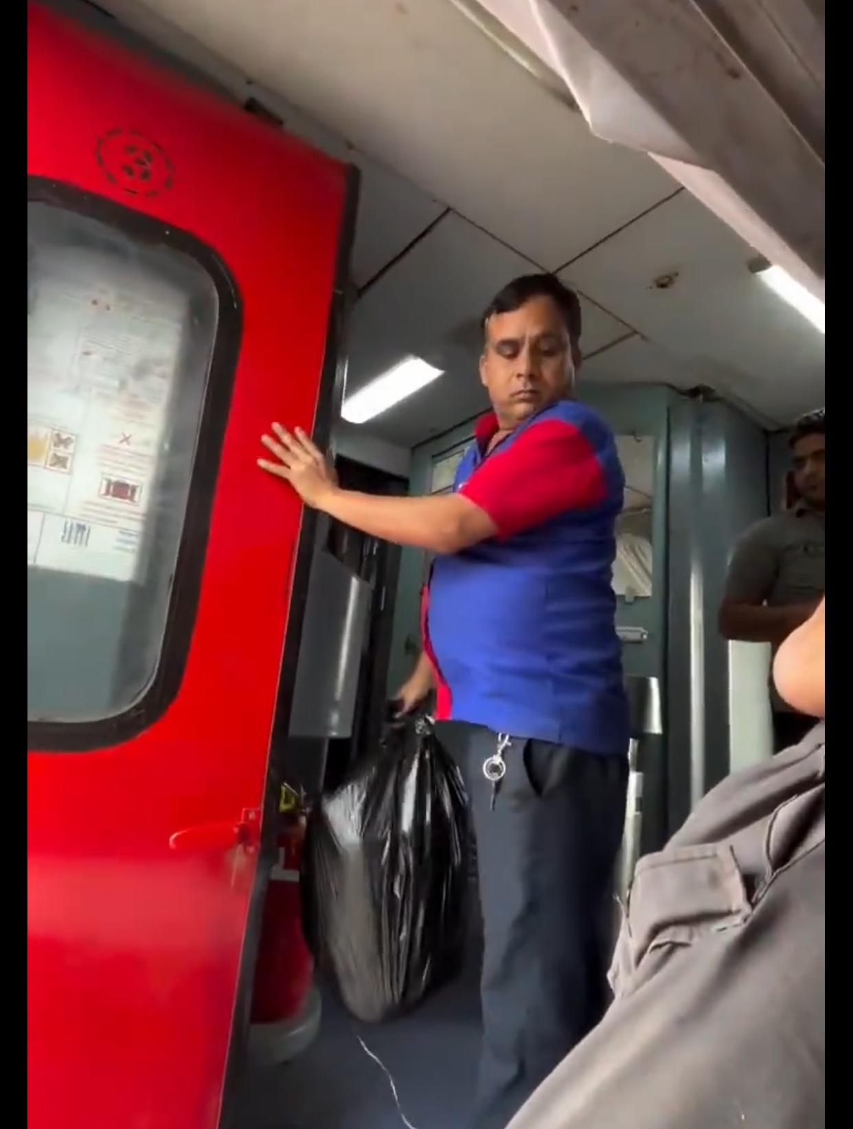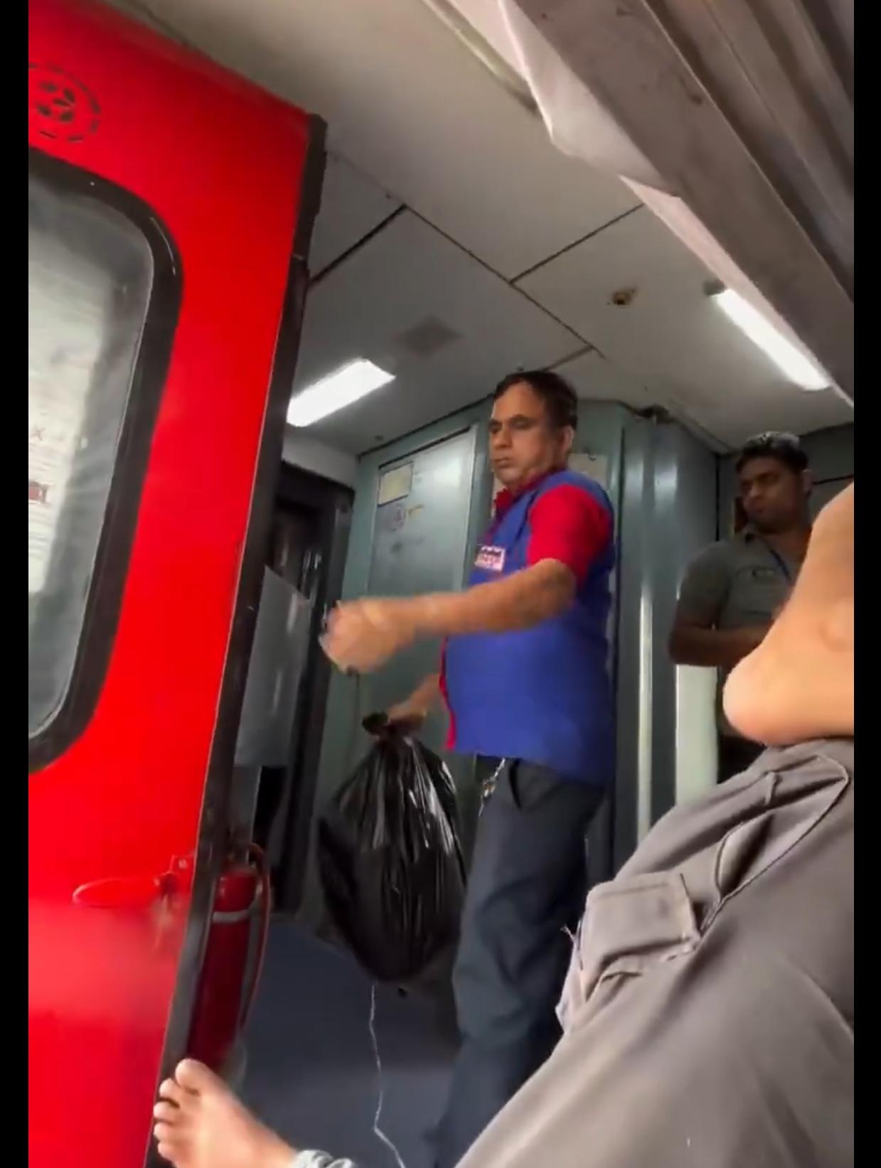 印度火车上的卫生工作人员处理火车上垃圾的方式,是直接把垃圾包在一个黑色塑料袋里,在火车行驶的过程中,沿铁轨一路扔出火车外面,简单便捷,高效处理,“造福”铁路两边的印度人。