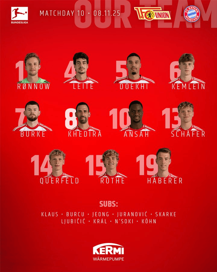 虎扑11月08日讯北京时间今晚22:30,德甲第10轮,柏林联合将坐镇主场对战拜仁。赛前,双方公布首发阵容。