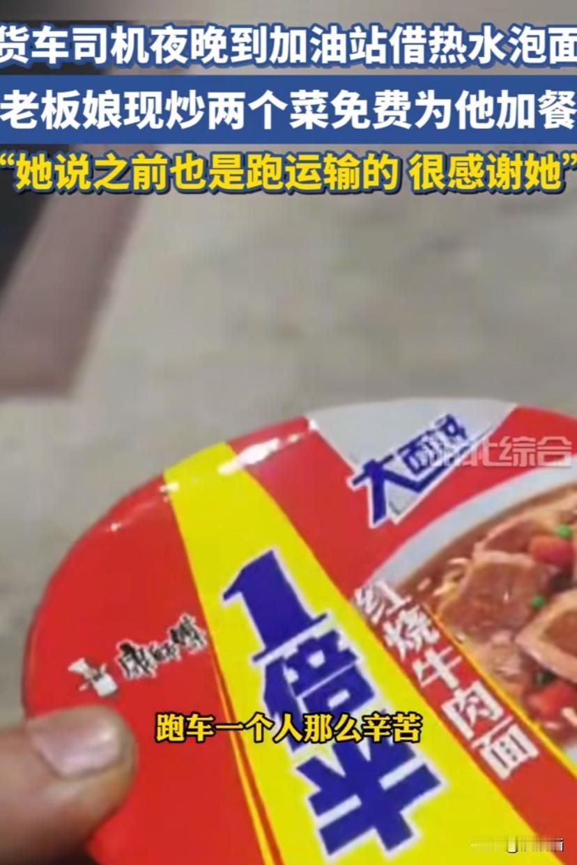 湖北荆州,货车司机在加油站休息借开水泡面,老板娘说:跑车太辛苦,你不要吃泡面,我