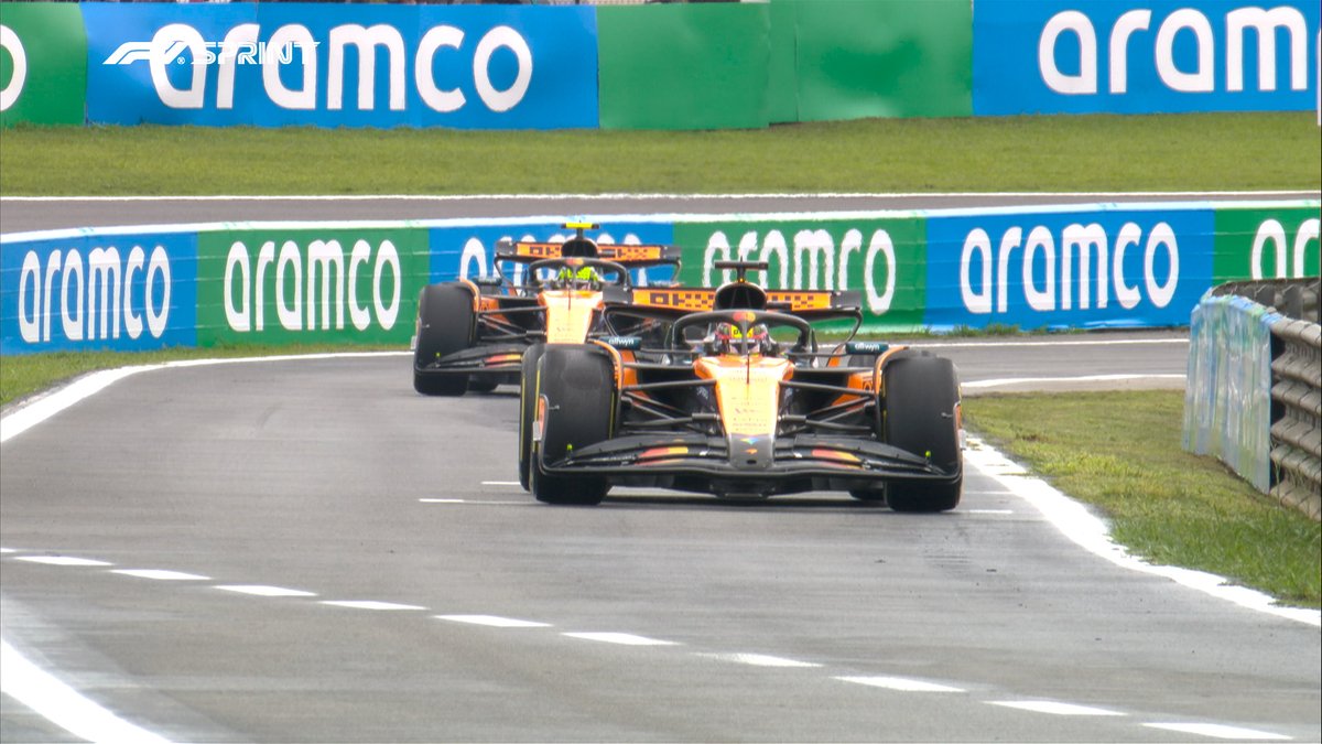F1官方推特账号报道。奥斯卡·皮亚斯特里和兰多·诺里斯驶上赛道进行暖胎圈。周六的F1冲刺赛即将开始。#F1Sprint#F1#BrazilGP
