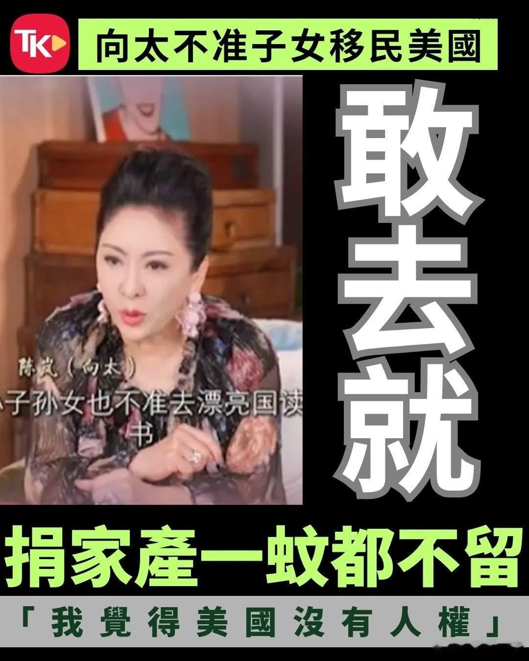 向太在视频中,奉劝各位千万不要移民美国,你付出的代价不可想像。她表示,「我觉得美国没有自由,也没有人权,而且又不安全,随便人都可以申请枪的。你看我八几年就在美国拍电影,那时候美国真的还行,现时乞丐、流浪汉、吸毒的人满街都是,不管是旧金山、洛杉矶、纽约,有些街你根本不可能去。」