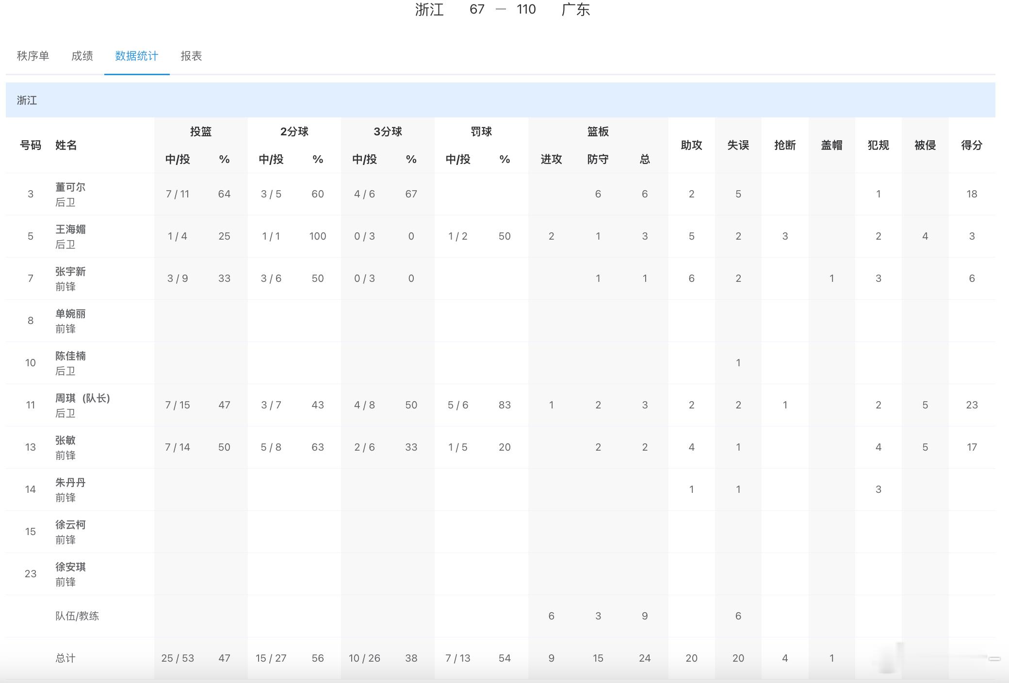 浙江:周琪23分、董可尔18分、张敏17分