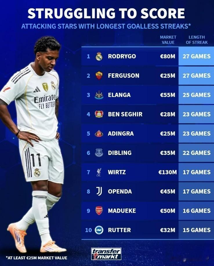 进球这么难吗?罗德里戈已经连续27场比赛未进球! 近日,《德国转会市场》德转盘点了五大联赛目前遭遇进球荒的攻击球员,其中皇马球员罗德里戈以连续27场比赛未进球排名第一,罗马的弗格森同样以27场排名第二,纽卡的伊兰加以28场排名第三,利物浦的维尔茨以17场排名榜第七。 罗德里戈身价高达8000万欧元,上赛季还为皇马贡献了14球10助攻的两双数据,没想到现在竟然遭遇了连续27场进球荒,真的是太不可思议了。 懂球的都知道,作为一个前锋,哪怕全都替补出战也不至于27场比赛0进球了,罗德里戈虽然被阿隆索弃用总是替补出战,但是27场的进球荒也太不应该了。 姆巴佩,凯恩,哈兰德都进球如麻,但是罗德里戈却一球未进,不得不说难道进球有这么难吗?