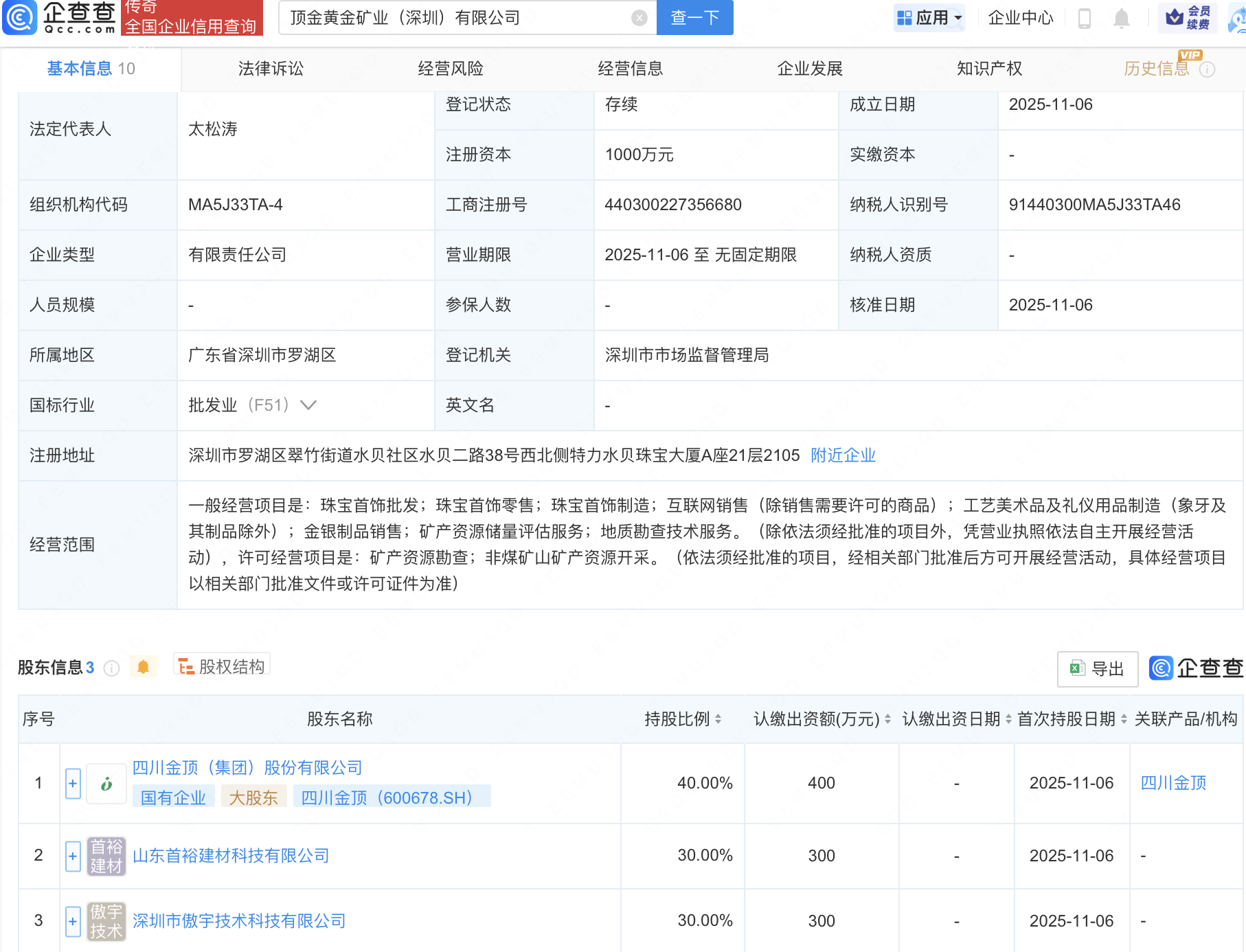 企查查APP显示,近日,顶金黄金矿业(深圳)有限公司成立,注册资本1000万元,经营范围包含:矿产资源储量评估服务;地质勘查技术服务;矿产资源勘查;非煤矿山矿产资源开采等。企查查股权穿透显示,该公司由四川金顶(600678)等共同持股。