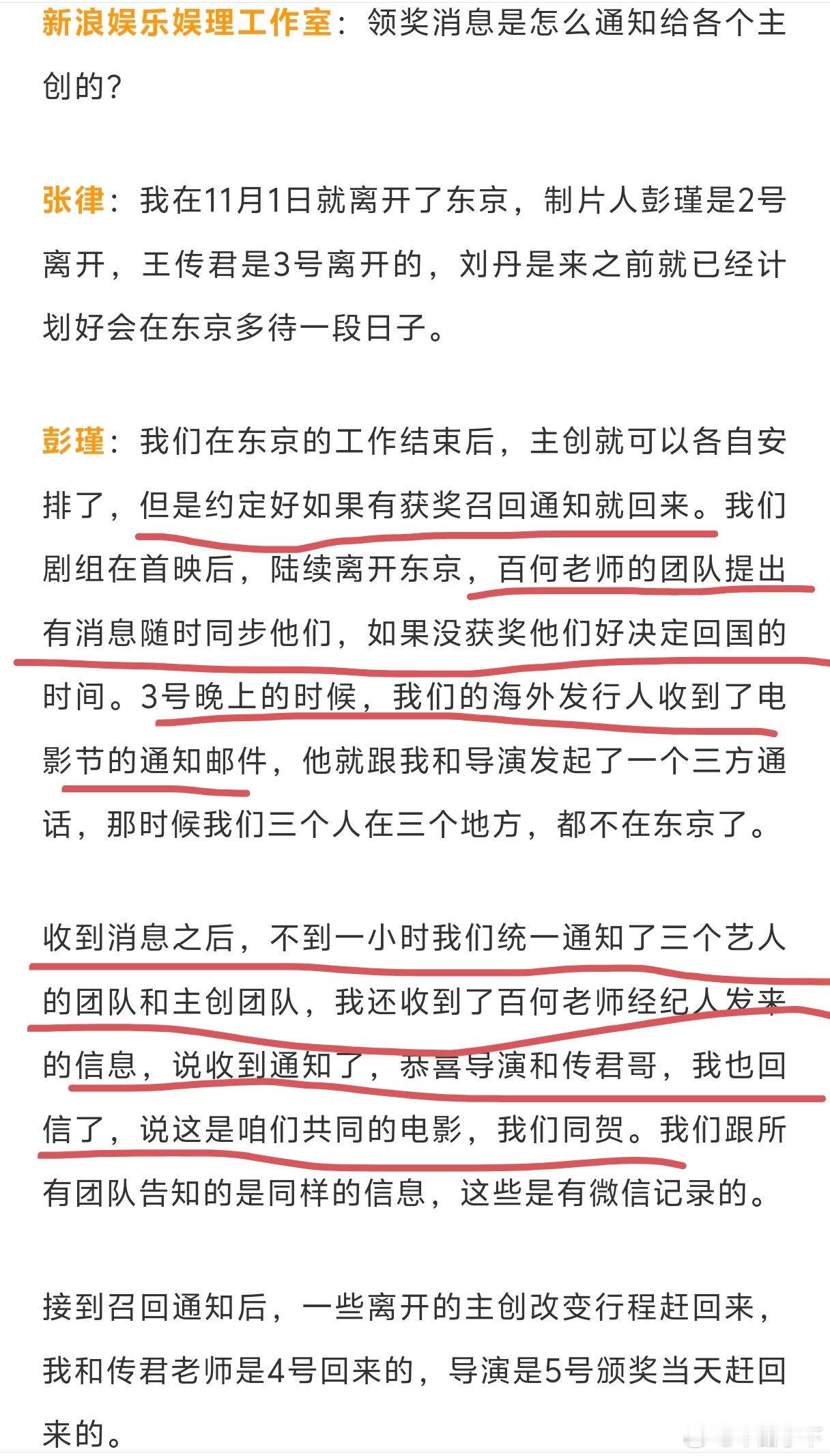 东京事变后续,春树制片人接受采访说获奖通知了白百何经纪人,白百何经纪人还跟她说恭喜导演和王传君,有微信截图为证