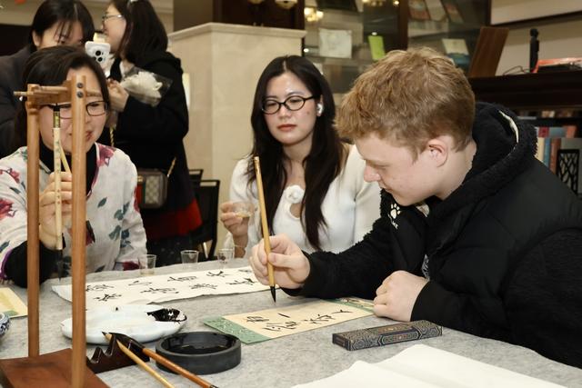 活动打破传统阅读推广的边界,以“沉浸式体验+跨文化交流”让文化落地生根。在“拾趣YOUNG浦·共享一杯中国茶”专场,日本、俄罗斯、韩国等国的留学生与市民围坐品茗,在老师指导下执笔书写“爱茶”“爱茶人有天地”等汉字,生涩笔触里满是对中华传统文化的好奇与热爱;泉州场特别设置蟳埔簪花非遗体验,读者戴上色彩艳丽的头饰打卡拍照,瞬间“穿越”到刺桐花下的非遗之城,直观感受泉州“半城烟火半城仙”的独特韵味。