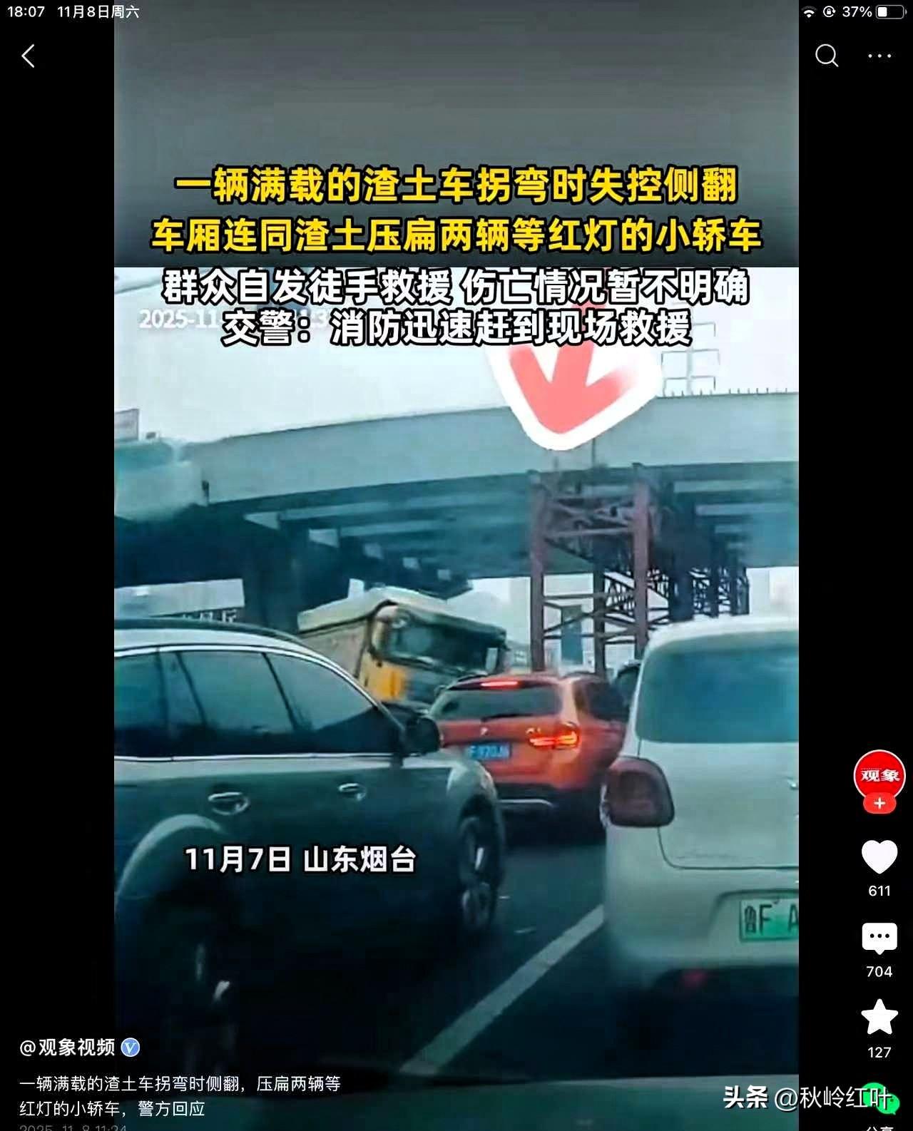 一死一伤,已经通报了!烟台电厂附近这个渣土车拐弯失控埋了两辆车。 现场画面冲击力强到让人不忍细看。一辆满载土石的渣土车在拐弯时突然失控,车身猛地侧翻,车厢里的土块、碎石瞬间像决堤的洪水般涌出来,径直砸向路边停放的两辆小车,瞬间就把车子吞没了大半。 其中那辆小红宝马的遭遇,更是让无数网友看红了眼眶。从视频里能清楚看到,危险降临的刹那,小红宝马明显动了一下,显然司机已经察觉到了危机,想加速冲出去躲开这场灭顶之灾。 可偏偏就在这生死一线的几秒里,车子停住了。或许是担心冲出去会追尾前车,或许是突如其来的恐惧让他迟疑了,可就是这短暂的犹豫,彻底断送了生机。要知道冲出去顶多是车辆受损,人大概率能安全,可这一停,就被厚重的土石牢牢埋在了下面。 后面那辆车里的人还算幸运,被路过的好心人拼死拉了出来,大概率没有生命危险,可小红宝马里的人,却再也没了消息。 真想问问渣土车司机,拐弯时到底多快才会失控?你手里的方向盘握的是别人的命!别觉得保险够多就无所谓,赔钱能换回来逝去的生命吗?往后余生,你能逃过良心的谴责吗? 大车的危险从来不是说说而已,可总有司机心存侥幸。