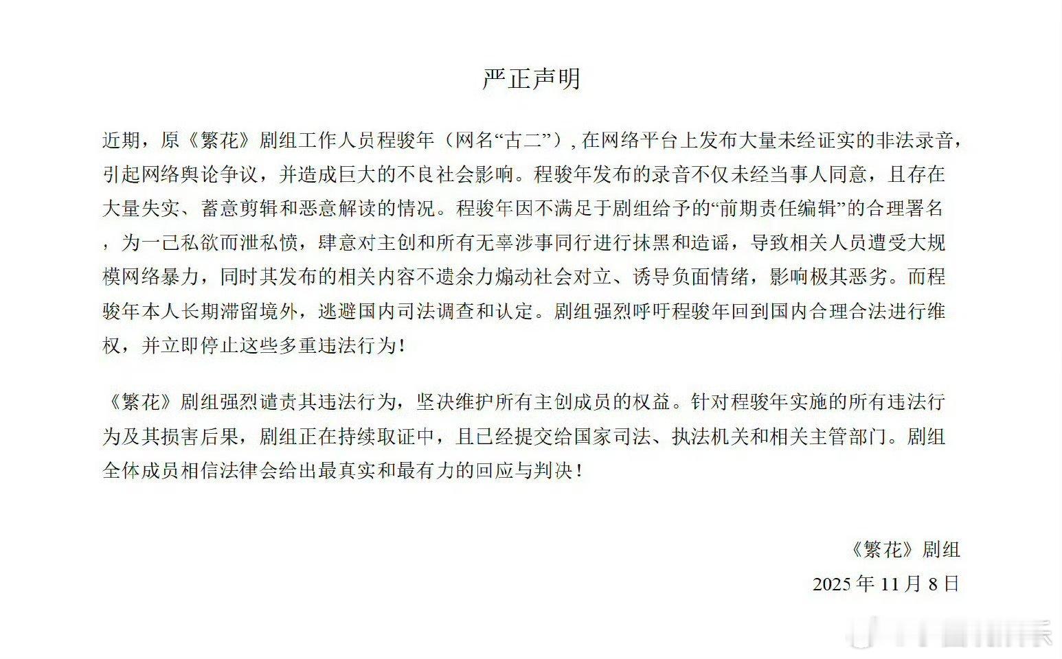 近期原剧组工作人员程骏年(网名“古二”)在网上发的那些录音,剧组直接发严正声明怼回去了——这些全是没经过当事人同意的非法录音,不仅掺了大量不实信息,还故意剪辑、恶意解读,纯属搞事情!