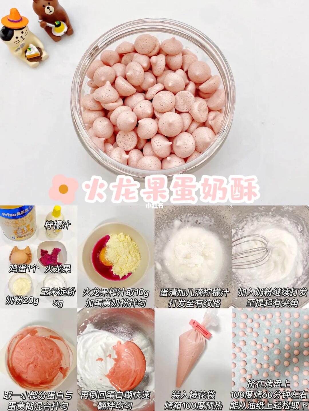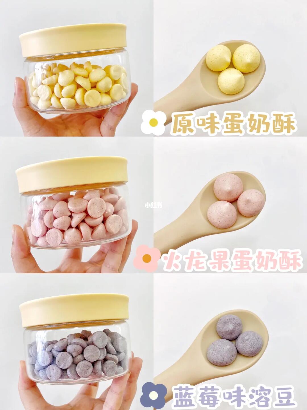 今天一次给大家解锁三种口味原味奶酥、火龙果奶酥和蓝莓溶豆(一般加全蛋的是奶酥,只加蛋清的就是溶豆啦❗️)
