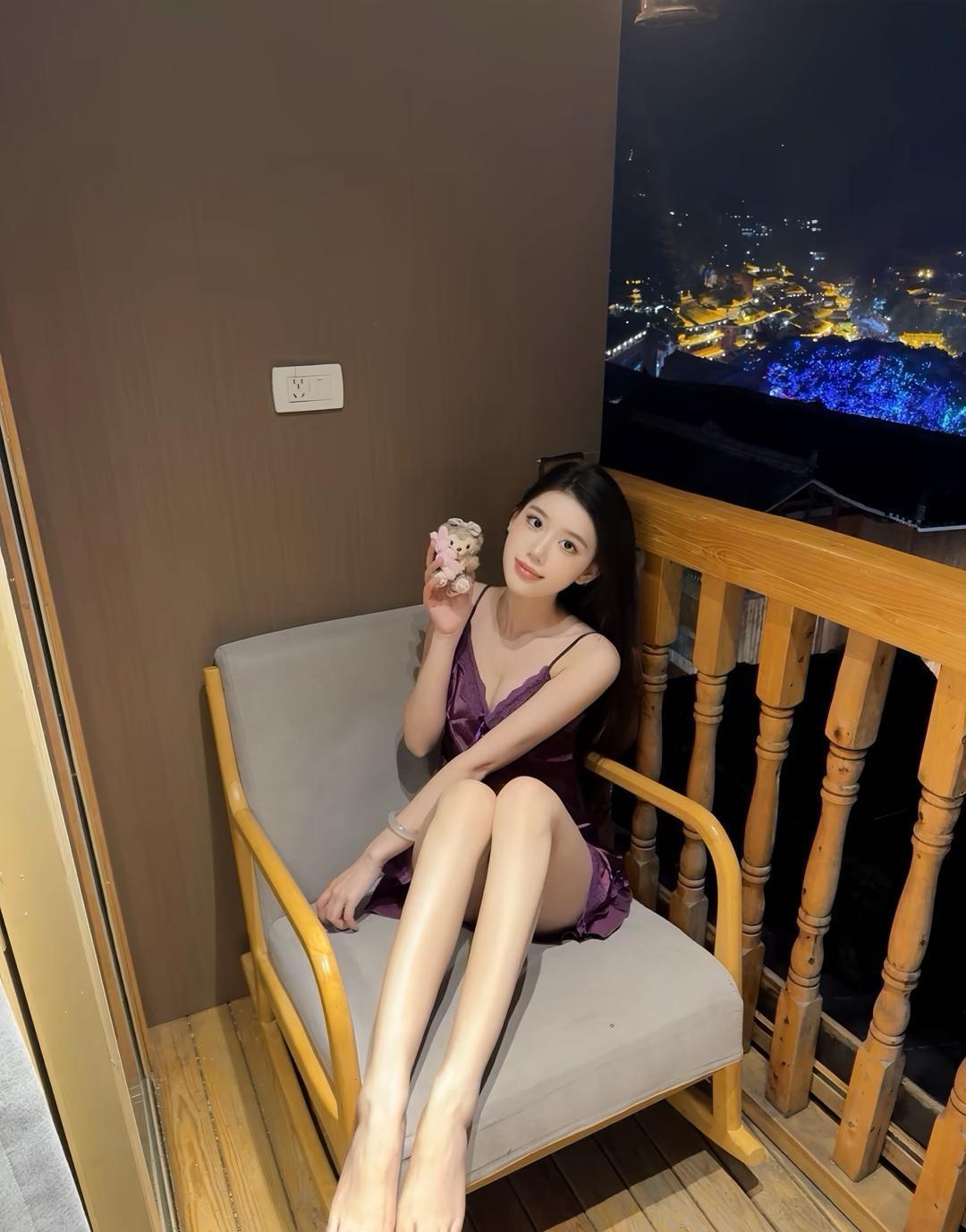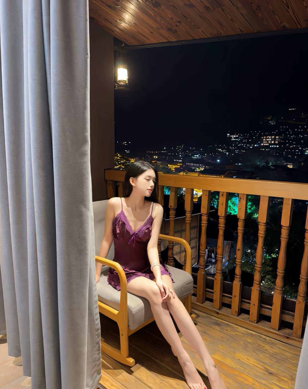 夜晚的阳台,紫裙少女倚栏赏灯海