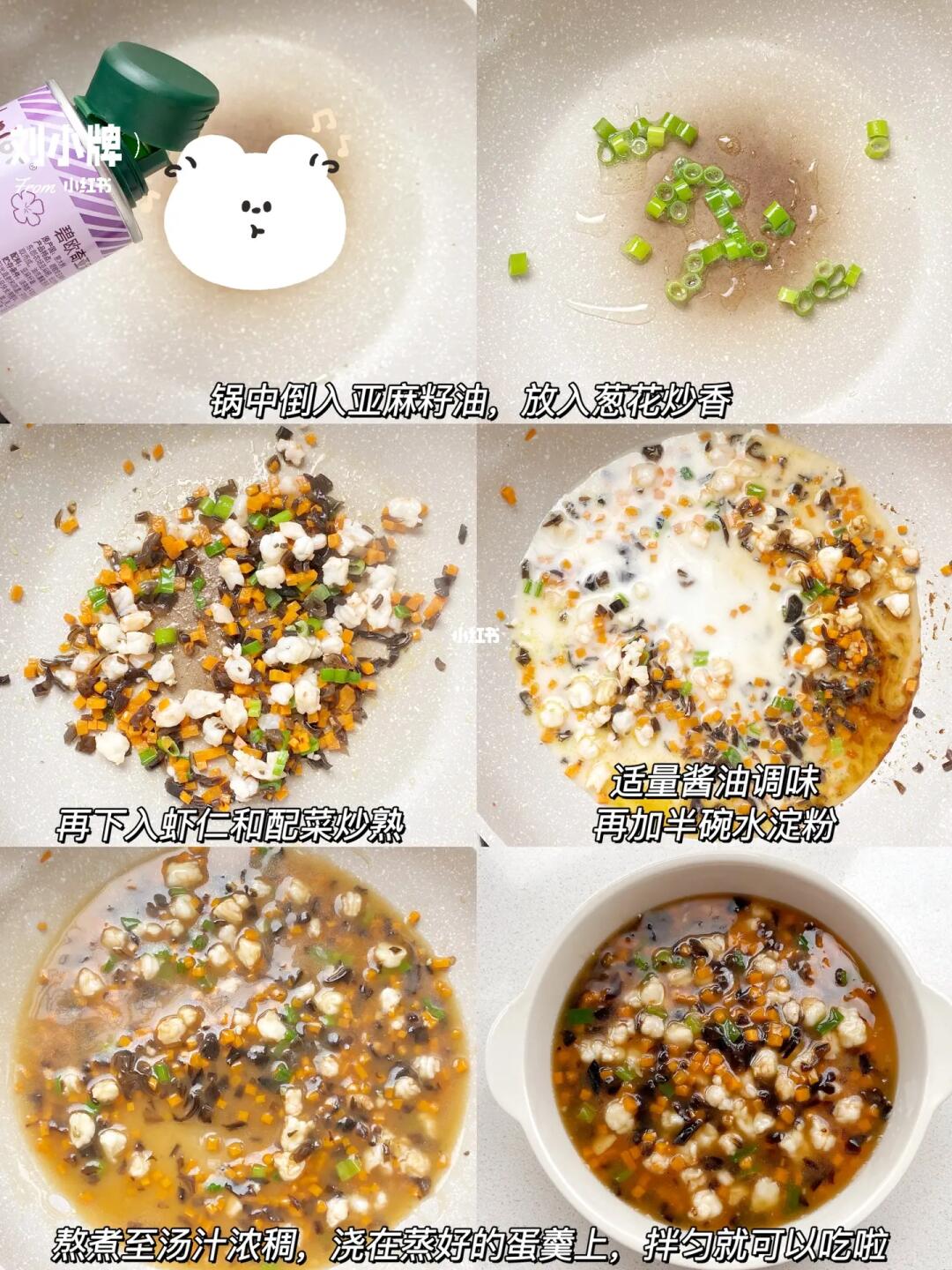 4⃣️取出蒸好的蛋羹,浇上卤汁,就可以开动啦‼️