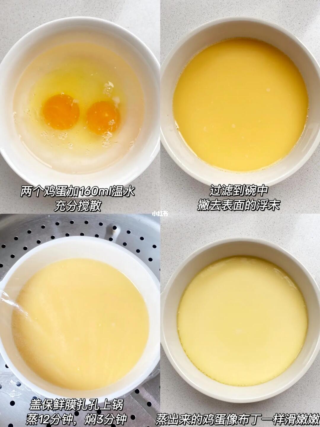 1⃣️鸡蛋打入碗加入 160ml的清水搅拌均匀,过筛到碗中,撇去表面的浮沫,盖保鲜膜扎小孔,上锅蒸12分钟焖3分钟出锅。
