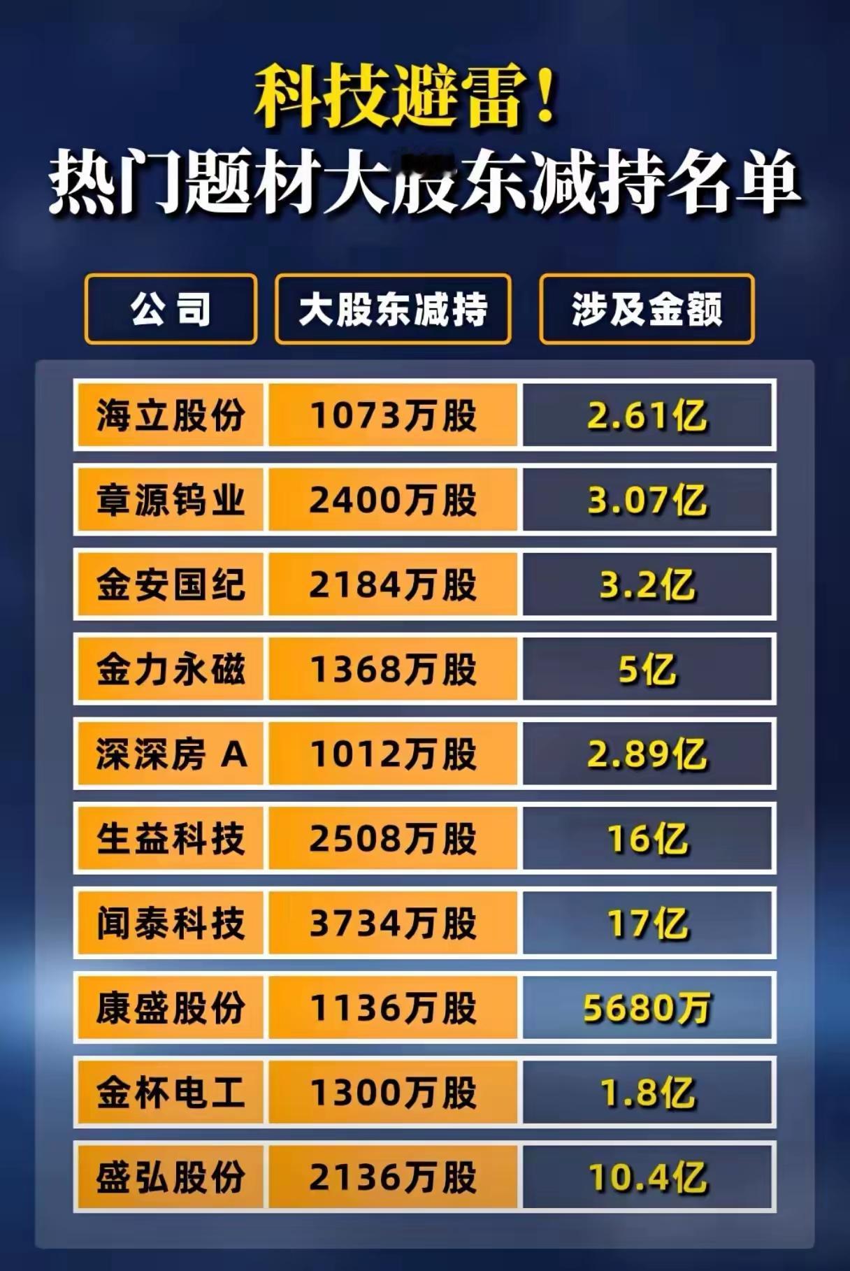 “科技避雷!热门题材大股东减持名单”,旨在提醒投资者关注部分热门科技或相关题材上市公司大股东近期减持股票的情况,可能暗示这些公司的股价或基本面存在一定风险。 第一张图片列出了十家公司的减持信息,包括:新易盛(减持1143万股,涉及金额37.49亿元)、中际旭创(550万股,26.4亿元)、天孚通信(990万股,8.77亿元)、东芯股份(1327万股,10.95亿元)、国光连锁(1501万股,3.15亿元)、永鼎股份(4386万股,6.6亿元)、电气风电(1333万股,2.86亿元)、金发科技(2637万股,5.22亿元)、西部黄金(2733万股,7.65亿元)、澜起科技(2290万股,30.5亿元)。这些公司多数属于科技或通信领域,减持金额普遍较高,其中中际旭创、澜起科技、新易盛等减持规模和金额尤为突出。 第二张图片则展示了另外十家公司的股东减持情况,包括:海立股份(减持1073万股,2.61亿元)、章源钨业(2400万股,3.07亿元)、金安国纪(2184万股,3.2亿元)、金力永磁(1368万股,5亿元)、深深房A(1012万股,2.89亿元)、生益科技(2508万股,16亿元)、闻泰科技(3734万股,17亿元)、康盛股份(1136万股,5680万元)、金杯电工(1300万股,1.8亿元)、盛弘股份(2136万股,10.4亿元)。这些公司行业分布相对多元,既有材料、稀土永磁、房地产,也有电子、电气设备等,其中生益科技和闻泰科技的减持金额较高,分别达到16亿元和17亿元。 综合来看,两张图片合计披露了二十家上市公司大股东近期的大额减持动向,集中在科技、通信、电子、材料等多个热门板块,减持总金额巨大,可能对市场情绪和相关个股走势产生一定影响,投资者需保持警惕,关注减持背后的动机与潜在风险。