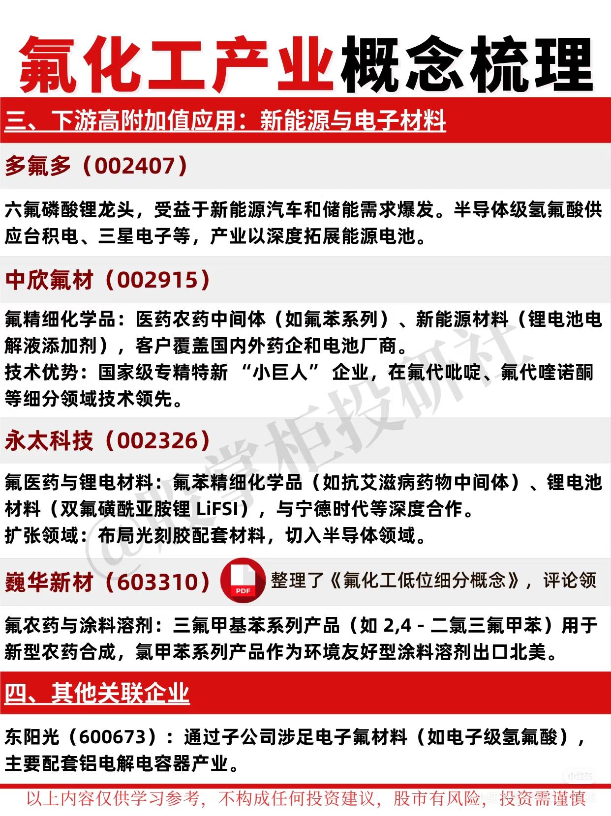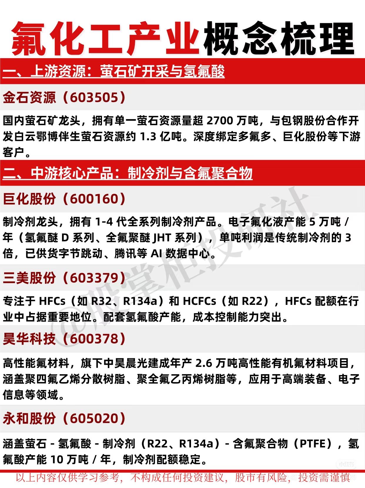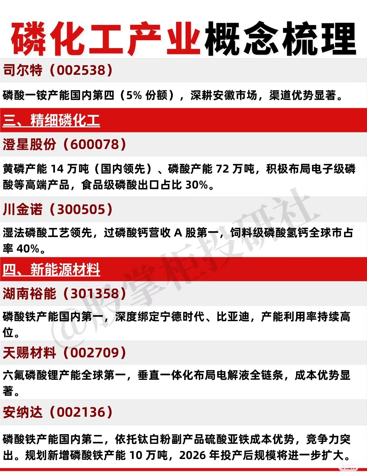 以下是对磷化工产业和氟化工产业的概念梳理总结: 一、磷化工产业概念梳理 (一)资源型龙头企业(掌控磷矿资源,具备全产业链能力) 1. 云天化(600096) - 国内最大磷矿采选企业之一,磷矿储量高达13亿吨,自给率超100%。 - 拥有“磷矿—磷肥—磷酸铁”完整产业链,规划50万吨磷酸铁锂项目。 2. 兴发集团(600141) - 磷矿储量5.8亿吨,为全球第二大草甘膦生产商。 - 布局“磷矿—黄磷—精细磷化工—新能源材料”全链条,半导体材料客户拓展超预期。 3. 中毅达(600610) - 磷酸二铵产能国内第二,2025年10月拟重启收购瓮福集团(磷矿储量5.3亿吨)。 - 若重组成功,其磷酸二铵产能有望跃居全球第一。 (二)传统磷肥企业(聚焦磷铵,向新能源延伸) 1. 新洋丰(000902) - 磷酸一铵产能全球第一,拥有“磷矿—磷酸—磷酸一铵—复合肥”完整产业链,成本控制领先。 - 积极布局新能源,规划20万吨磷酸铁产能,已绑定宁德时代等大客户。 2. 湖北宜化(000422) - 磷酸二铵产能130万吨/年,配套磷矿资源1.3亿吨,受益于国家磷肥保供稳价政策。 - 与宁德时代合资建设磷酸铁项目,新能源业务正逐步放量。 (三)细分领域冠军(技术或区域优势明显) 1. 川恒股份(002895) - 饲料级磷酸二氢钙全球市占率第一,首创“半水-二水法”湿法磷酸工艺,能耗降低40%。 2. 粤桂股份(000833) - 硫铁矿制酸配套磷化工,磷酸一铵产能国内领先,区域资源整合能力强。 (四)精细磷化工企业(专注高端磷化工产品) 1. 澄星股份(600078) - 黄磷产能14万吨(国内领先),磷酸产能72万吨,积极布局电子级磷酸等高端产品,食品级磷酸出口占30%。 2. 川金诺(300505) - 湿法磷酸工艺领先,过磷酸钙营收A股第一,饲料级磷酸氢钙全球市占率40%。 (五)新能源材料企业(绑定新能源赛道,聚焦磷酸铁与电解液材料) 1. 湖南裕能(301358) - 磷酸铁产能国内第一,深度绑定宁德时代、比亚迪,产能利用率持续高位。 2. 安纳达(002136) - 磷酸铁产能国内第二,依托钛白粉副产品硫酸亚铁具有成本优势,规划2026年前新增10万吨产能。 3. 天赐材料(002709) - 六氟磷酸锂产能全球第一,垂直一体化布局电解液全链条,成本优势显著。 (六)行业逻辑与投资主线 1. 政策驱动:国家限制磷铵、黄磷新增产能,推动落后产能出清,行业集中度提升。 2. 资源稀缺性:磷矿平均品位下降至19%,开采成本逐年上升,拥有磷矿资源企业具备护城河。 3. 新能源需求:每吨磷酸铁锂消耗约2.5吨磷矿石,预计到2030年新能源领域用磷占比将达25%,转型领先企业受益明显。 二、氟化工产业概念梳理 (一)上游资源:萤石矿与氢氟酸 1. 金石资源(603505) - 国内萤石矿龙头,单一萤石资源量超2700万吨,与包钢股份合作开发伴生萤石资源约1.3亿吨。 - 深度绑定多氟多、巨化股份等下游客户。 (二)中游核心产品:制冷剂与含氟聚合物 1. 巨化股份(600160) - 制冷剂行业龙头,拥有1-4代全系列制冷剂,电子氟化液产能达5万吨/年(如氢氟醚D系列、全氟聚醚JHT系列),单吨利润为传统制冷剂3倍,供货AI数据中心(如字节、腾讯)。 2. 三美股份(603379) - 专注HFCs(如R32、R134a)和HCFCs(如R22),HFCs配额占优,配套氢氟酸,成本控制力强。 3. 昊华科技(600378) - 高性能氟材料供应商,旗下中昊晨光年产2.6万吨高性能有机氟材料(如聚四氟乙烯、聚全氟乙烯),应用于高端装备与电子信息。 4. 永和股份(605020) - 涵盖萤石—氢氟酸—制冷剂(R22、R134a)—含氟聚合物(PTFE),氢氟酸产能10万吨/年,制冷剂配额稳定。 (三)下游高附加值应用:新能源与电子材料 1. 多氟多(002407) - 六氟磷酸锂龙头,受益于新能源车与储能爆发,半导体级氢氟酸供货台积电、三星。 2. 中欣氟材(002915) - 氟精细化学品(如医药农药中间体、电解液添加剂),国家级“小巨人”企业,技术领先于氟代吡啶、氟代喹诺酮等领域。 3. 永太科技(002326) - 氟医药与锂电材料(如双氟磺酰亚胺锂LiFSI),与宁德时代深度合作,布局光刻胶材料,进军半导体。 4. 巍华新材(603310) - 氟农药与环保涂料溶剂(如三氟甲基苯、氯甲苯系列),出口北美,用于新型农药及环保涂料。