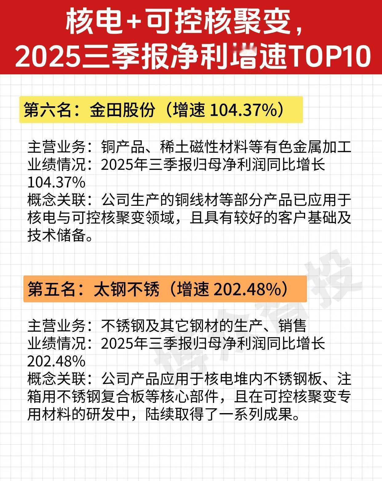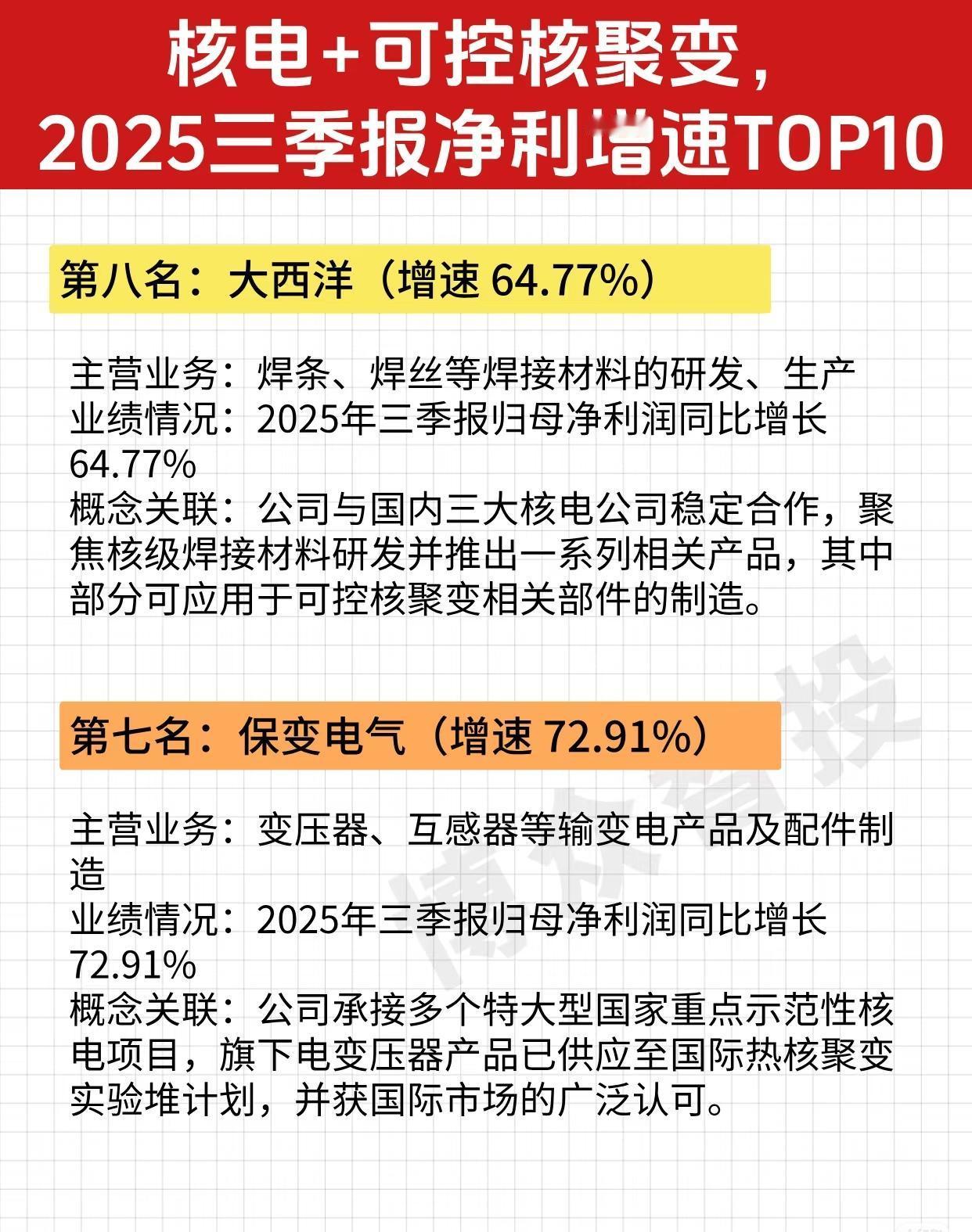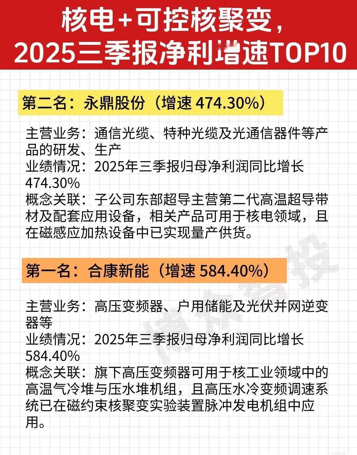 以下是关于“核电 + 可控核聚变,2025三季报净利增速TOP10”企业的完整总结,按排名顺序整理了各企业的主营业务、2025年三季报归母净利润增速、以及与核电或可控核聚变相关的概念关联: 🏆 核电 + 可控核聚变,2025三季报净利增速TOP10 企业汇总 ✅ 第一名:合康新能(增速 584.40%) - 主营业务:高压变频器、户用储能及光伏并网逆变器等 - 业绩亮点:2025年三季报归母净利润同比增长 584.40%,增速排名第一 - 概念关联: - 高压变频器产品可用于核工业领域中的高温气冷堆与压水堆机组 - 高压水冷变频调速系统已应用于磁约束核聚变实验装置的脉冲发电机组 ✅ 第二名:永鼎股份(增速 474.30%) - 主营业务:通信光缆、特种光缆及光通信器件等产品的研发、生产 - 业绩亮点:2025年三季报归母净利润同比增长 474.30% - 概念关联: - 子公司东部超导主营第二代高温超导带材及配套应用设备 - 相关产品可用于核电领域,并在磁感应加热设备中已实现量产供货 ✅ 第三名:远东股份(增速 268.86%) - 主营业务:电线电缆、电芯、光缆等产品的研发、生产 - 业绩亮点:2025年三季报归母净利润同比增长 268.86% - 概念关联: - 子公司安缆是国内首家满足“华龙一号”国内外首堆需求的企业 - 核级电缆已应用于30余台核电机组 ✅ 第四名:广大特材(增速 213.65%) - 主营业务:合金制品及材料等特钢材料及其零部件的研发、生产 - 业绩亮点:2025年三季报归母净利润同比增长 213.65% - 概念关联: - 特种不锈钢用于核电装备等领域 - 核聚变超导线圈铠甲用材料已实现批量供货 ✅ 第五名:太钢不锈(增速 202.48%) - 主营业务:不锈钢及其他钢材的生产、销售 - 业绩亮点:2025年三季报归母净利润同比增长 202.48% - 概念关联: - 产品应用于核电堆内不锈钢板、注箱用不锈钢复合板等核心部件 - 在可控核聚变专用材料研发中取得一系列成果 ✅ 第六名:金田股份(增速 104.37%) - 主营业务:铜产品、稀土磁性材料等有色金属加工 - 业绩亮点:2025年三季报归母净利润同比增长 104.37% - 概念关联: - 公司生产的铜线材等部分产品已应用于核电与可控核聚变领域 - 拥有良好的客户基础及技术储备 ✅ 第七名:保变电气(增速 72.91%) - 主营业务:变压器、互感器等输变电产品及配件制造 - 业绩亮点:2025年三季报归母净利润同比增长 72.91% - 概念关联: - 承接多个特大型国家重点示范性核电项目 - 其变压器产品已供应至国际热核聚变实验堆计划(ITER),并获国际市场认可 ✅ 第八名:大西洋(增速 64.77%) - 主营业务:焊条、焊丝等焊接材料的研发、生产 - 业绩亮点:2025年三季报归母净利润同比增长 64.77% - 概念关联: - 与国内三大核电公司稳定合作 - 聚焦核级焊接材料研发,部分产品可应用于可控核聚变相关部件的制造 ✅ 第九名:哈焊华通(增速 53.90%) - 主营业务:焊丝、金属功能合金材料等熔焊材料的研发、生产 - 业绩亮点:2025年三季报归母净利润同比增长 53.90% - 概念关联: - 获核能行业协会认可 - 研制的不锈钢、镍基合金等材料可用于三代、四代核电工程 - 为核聚变设备提供高质量焊接材料 ✅ 第十名:河钢股份(增速 44.71%) - 主营业务:板材、带钢等黑色金属的冶炼和加工 - 业绩亮点:2025年三季报归母净利润同比增长 44.71% - 概念关联: - 为国内首台套可控核聚变装置、“华龙一号”核电等国内外重点项目提供了优质钢材等关键材料 🔍 总结亮点: - 增速最快的是合康新能(584.40%),其产品直接服务于核工业及核聚变实验装置,技术门槛高、应用前景广阔。 - 永鼎股份、远东股份、广大特材、太钢不锈等企业,凭借在超导材料、核级电缆、特种钢材、焊接材料等方面的技术积累,深度参与核电与可控核聚变产业链。 - 保变电气的产品已进入国际热核聚变实验堆(ITER),代表中国高端装备制造业的国际影响力。 - 整体来看,这10家企业覆盖了核电与可控核聚变领域的关键材料、核心设备、电力控制与连接技术,显示出中国在该战略高科技领域的全产业链布局与高速增长态势。