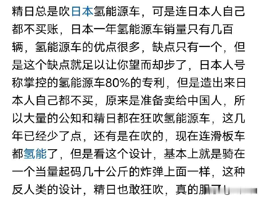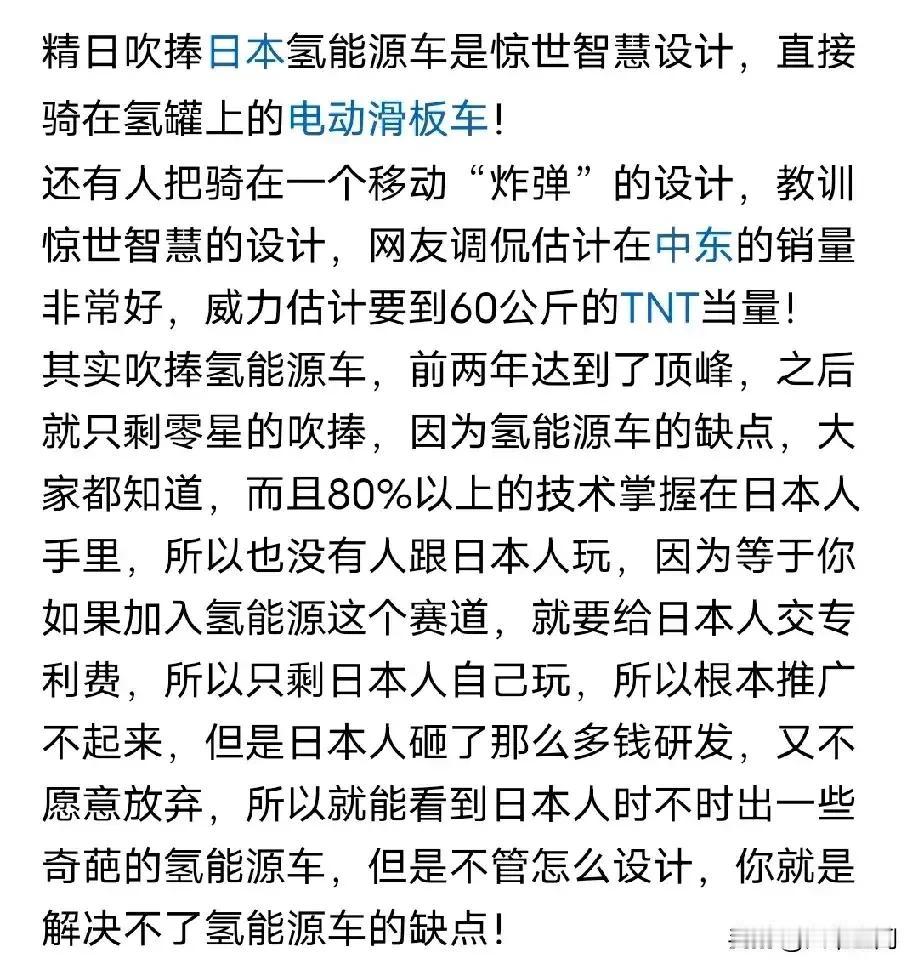 为什么叫川普都知道氢能源车的危害巨大,一旦发生爆炸,威力堪比炸弹,但是某些精日就是一直在吹捧,一个电瓶车,电池换成一个氢气罐,就被吹成惊世智慧设计,这个设计,估计连勇敢的中东人看了都摇头,别的不说日本有几个人买氢能源车的,一年也就卖了几百辆,感觉日本就是专门为中国市场打造的氢能源车,奈何没人买单,估计精日自己都不会买,但就是一直在使劲鼓吹,到底图什么呢?不累吗?