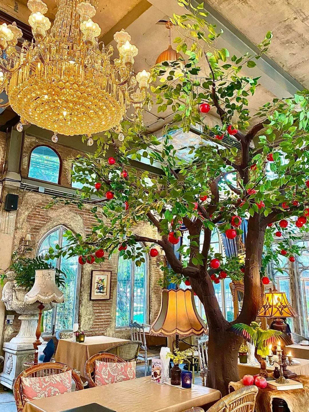 这是一家在ins上非常🔥的网红餐厅,餐厅每过一段时间也会根据季节和节日来进行主题装饰,比如现在就是非常童话的苹果主题,很多人都穿着礼服去拍照~