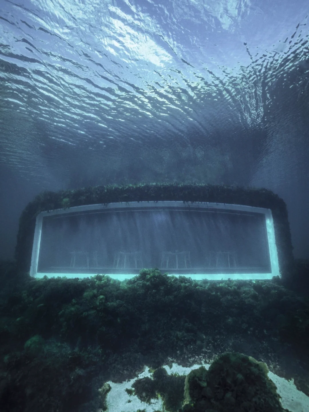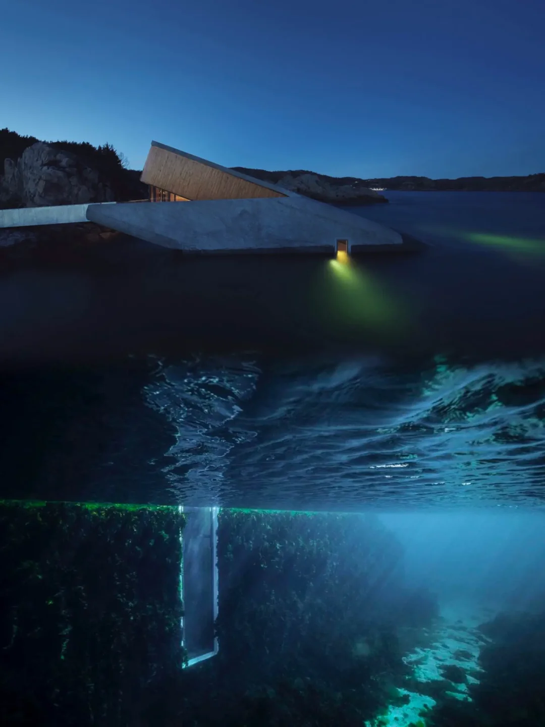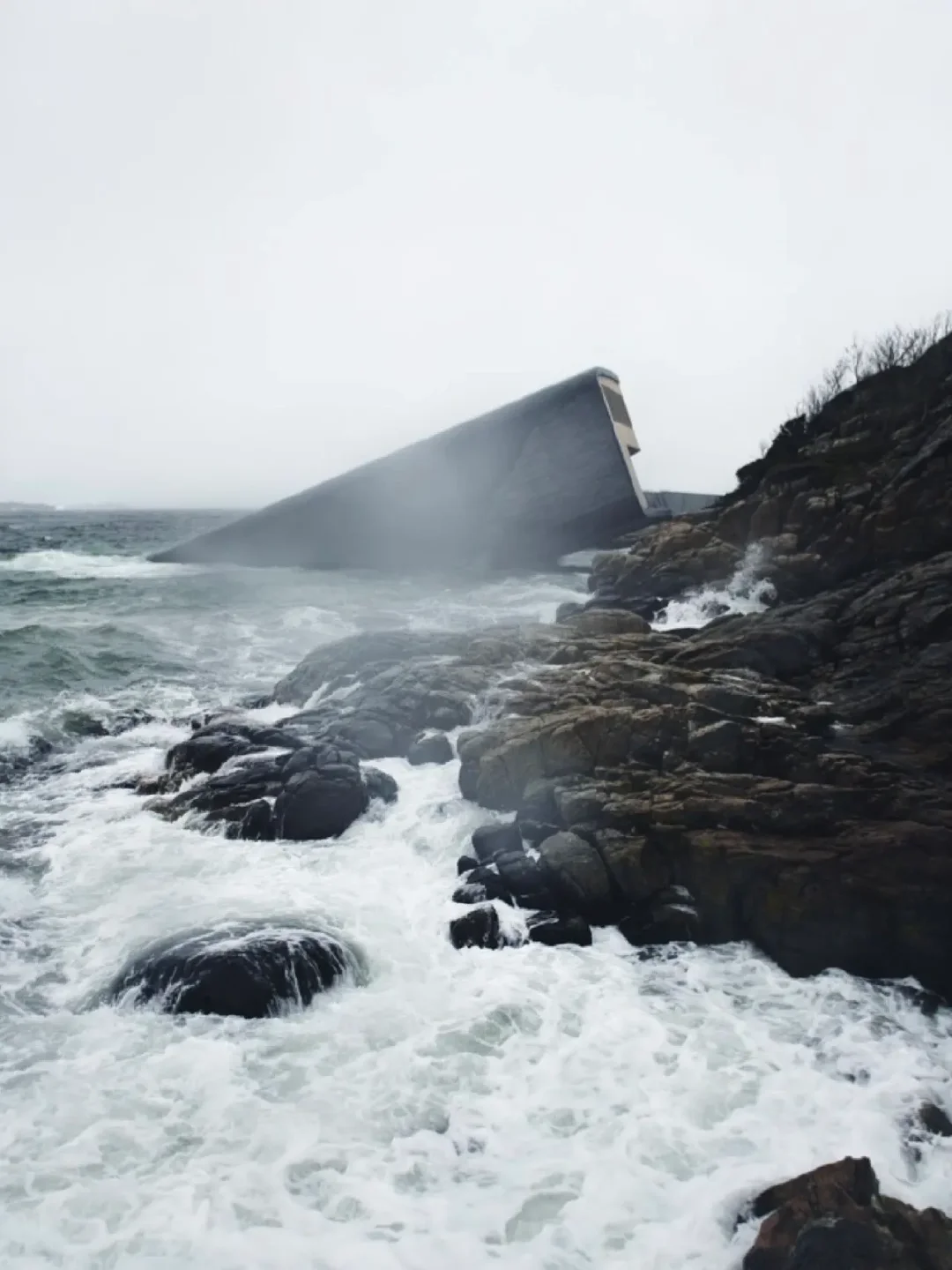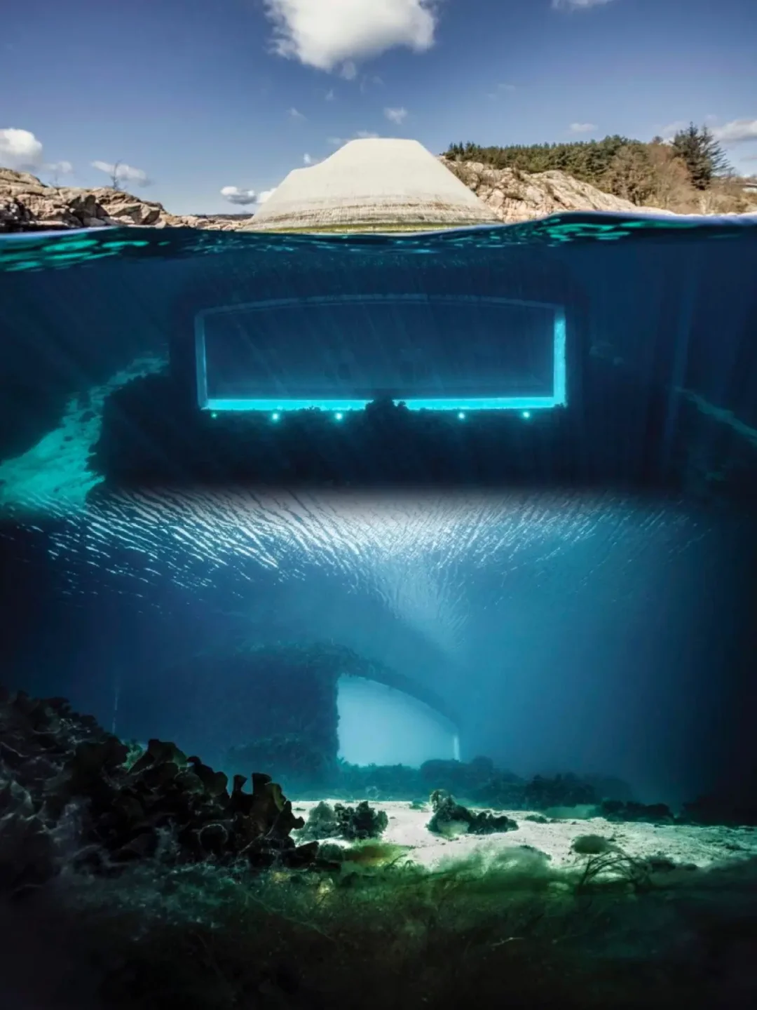 🔹餐厅位于挪威南端的斯潘格里德水深5米 处 。(Under)在挪威语当中也包含“奇迹”的意义。餐厅有一个大窗户, 顾客们能在用餐时观赏海洋生态,看着绿鳕、鳕鱼, 以及螃蟹、龙虾和狗鱼在海藻间穿梭。透过大窗户观看海底的感受与水族馆不同,眼前的景色会更加真实