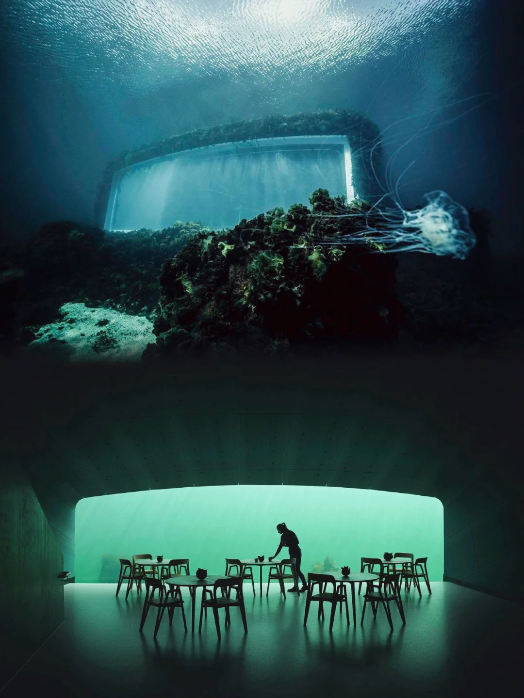 位于挪威海岸线的最南端有一家水下餐厅,是真的在水下!!坐在餐厅中甚至能看到各式各样的海中生物游来游去,地理位置十分独特。在这片咸水和半咸水的环境中,海洋物种十分繁盛,形成了丰富多样的自然生态~