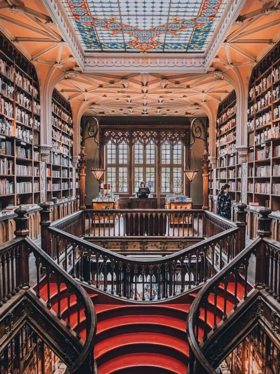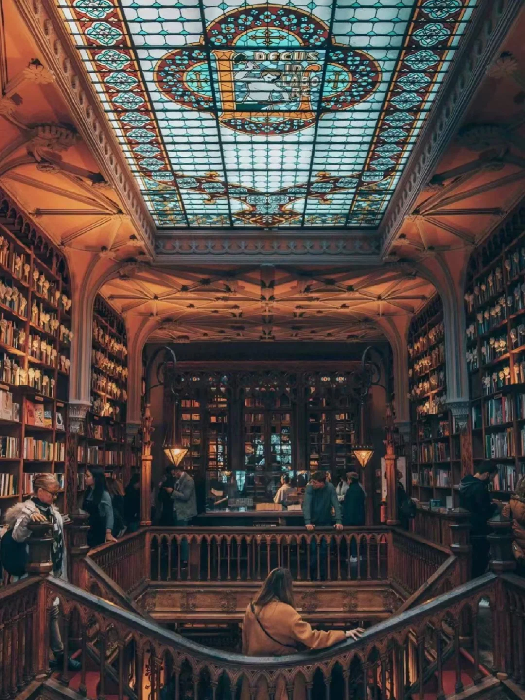 书店建于 1906 年,这座建筑的哥特式外观以其石雕和具有宗教色彩的画作非常细致,从外面看起来更像是一座教堂,而不是一家书店。除了漂浮楼梯的灵感来源,天花板上有一扇巨大的彩色玻璃窗,上面写着“decus in labore”,这是书店所有者的座右铭,意思是“工作中的荣誉”