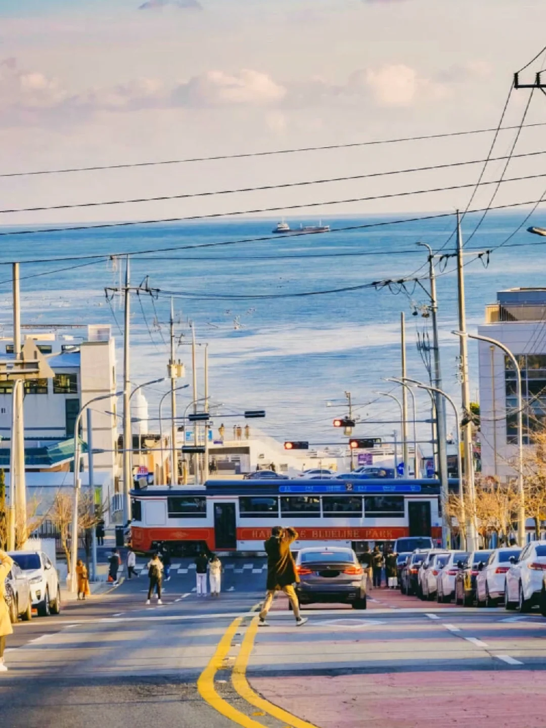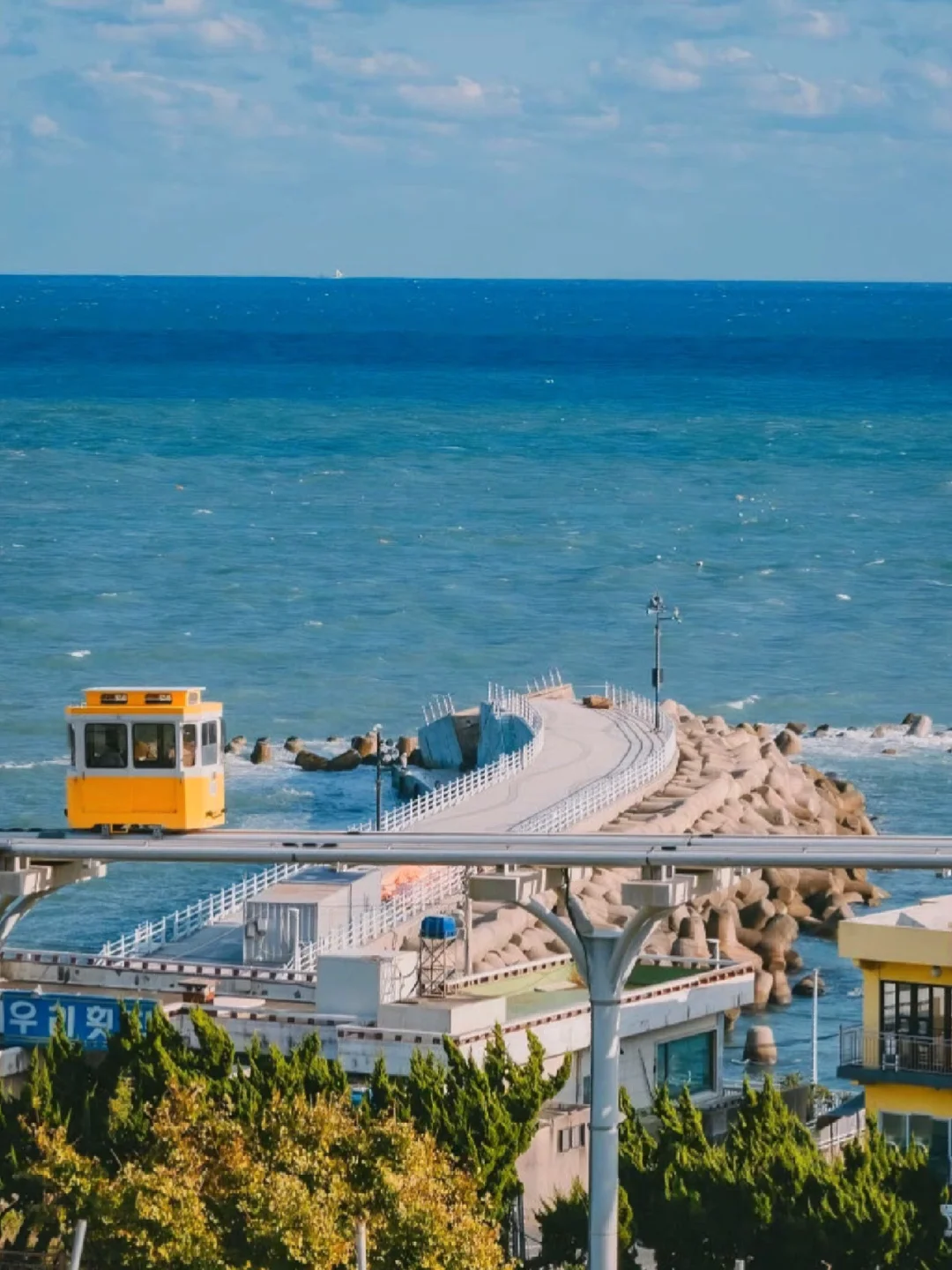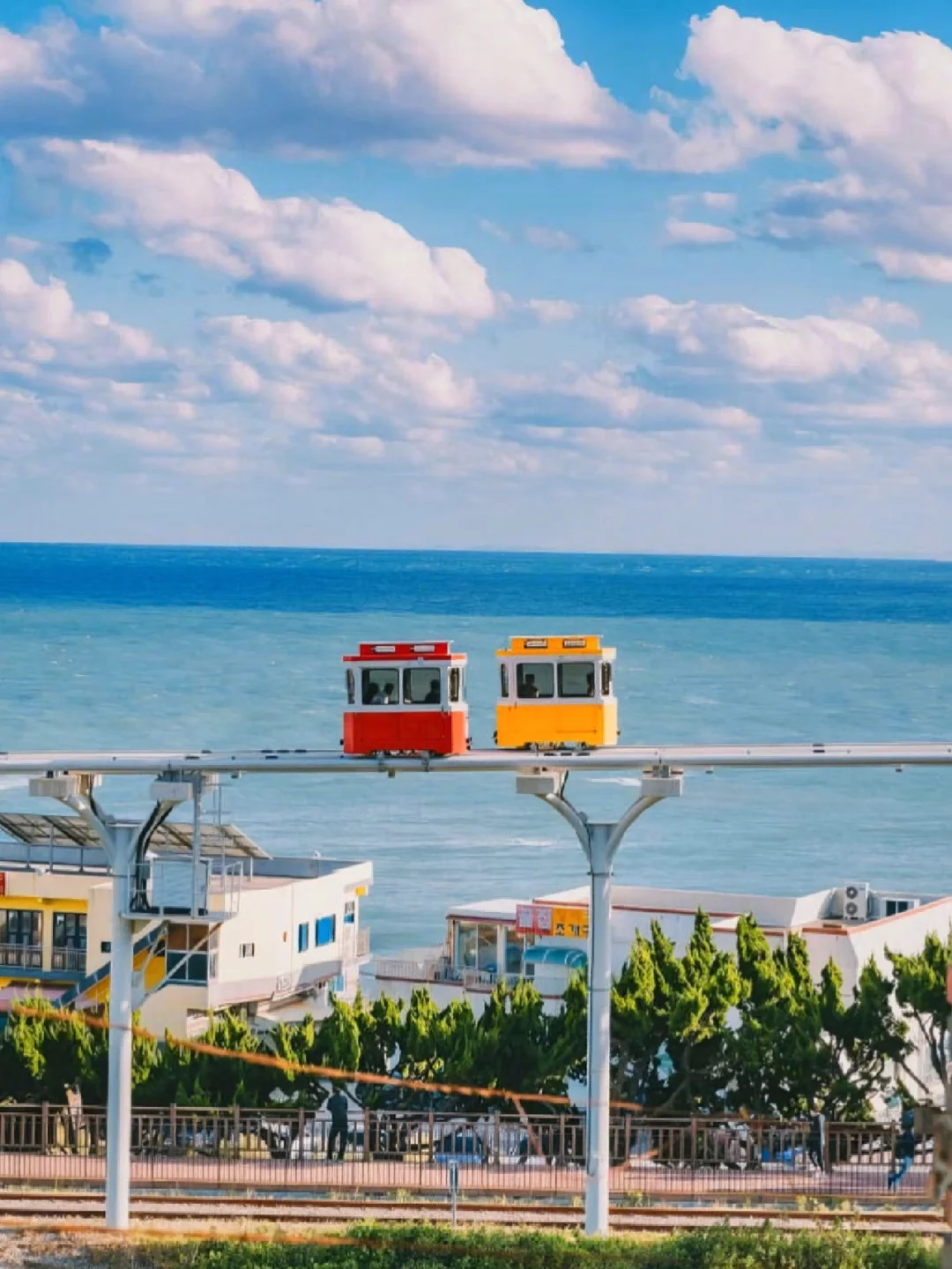 2⃣️坐上【胶囊小火车和海岸列车】🚃:这是釜山热门的打卡地,五颜六色的小火车和蔚蓝的大海交相辉映,一个是行走在天空轨道的胶囊仓 ,另一个则是走地面铁道海岸列车🚋!在远处观望已经相当抢眼