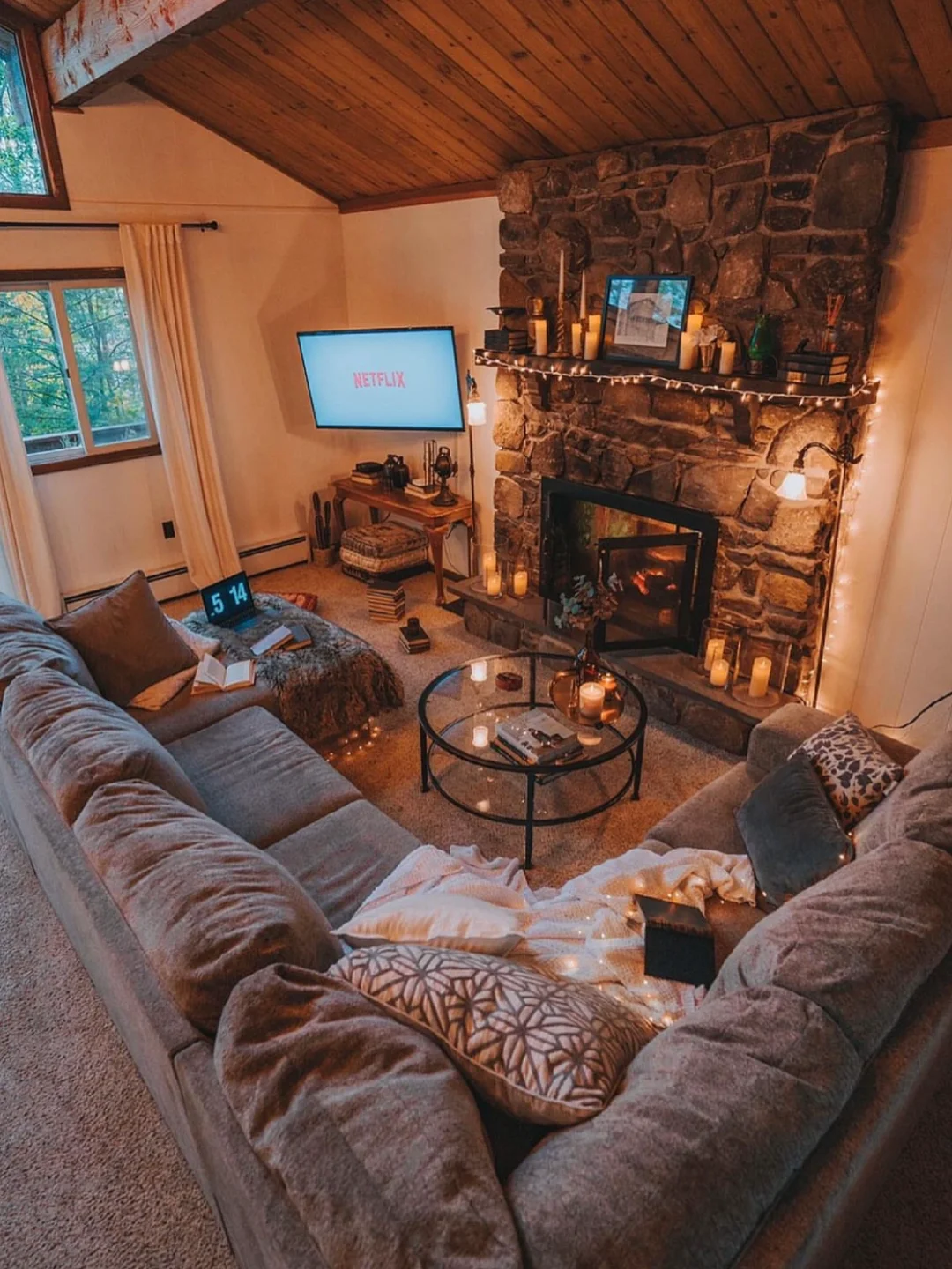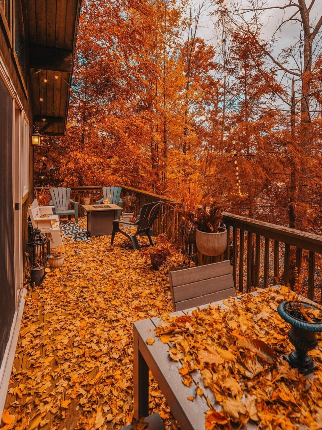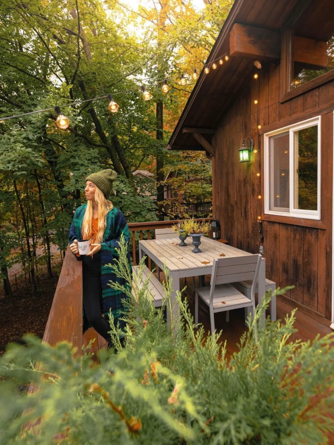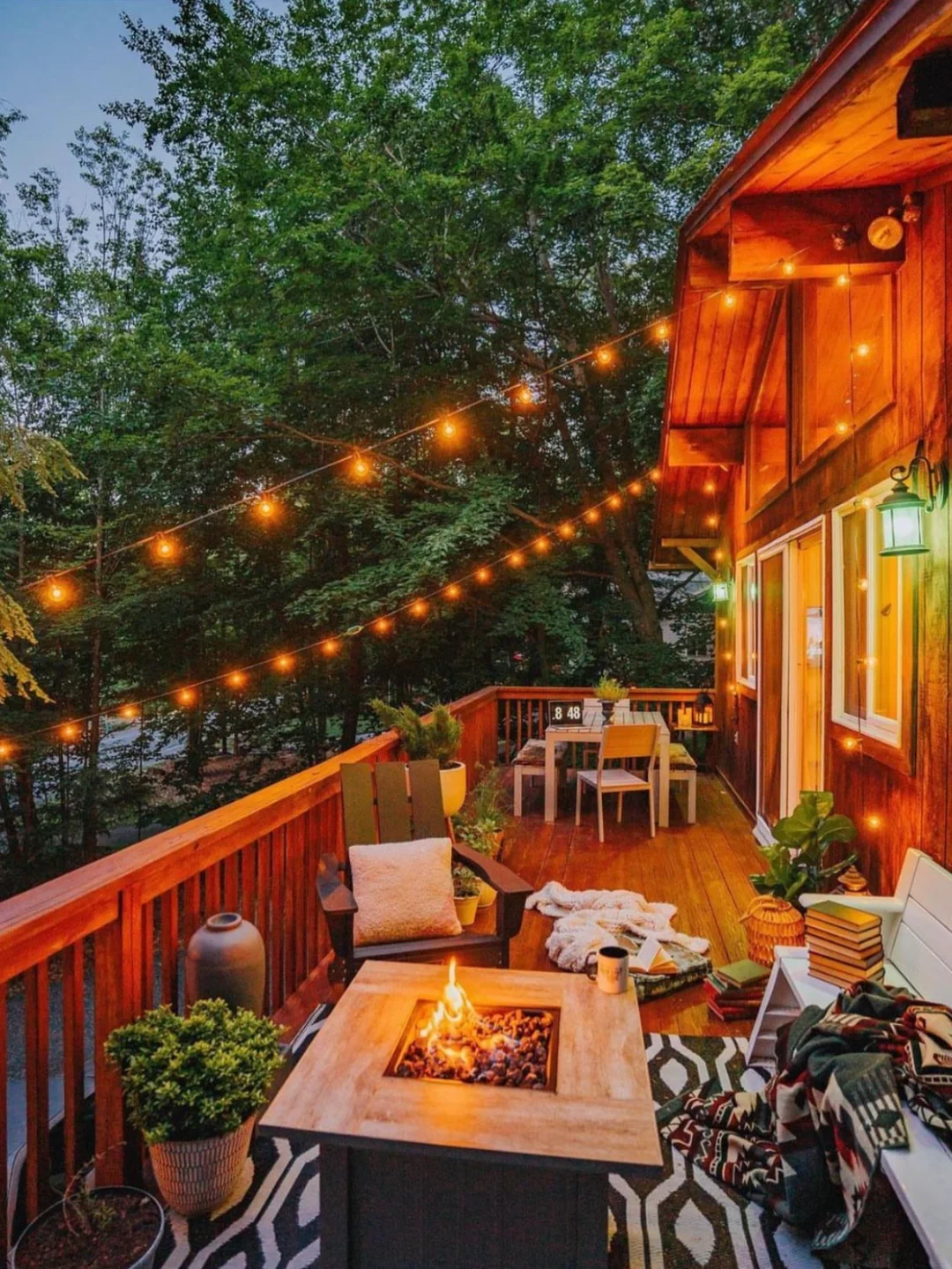 🔹每逢秋冬季节,木屋阳台上会落满枫叶和雪花,伴着星空一样的露营灯和室外火炉,仿佛童话世界