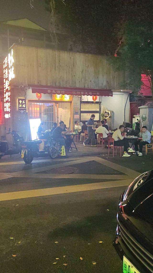 6日晚10点,记者实地探访该酒馆,只见门前人行道上已摆出三张小桌,让原本狭窄的通道变得十分拥挤。当客流量进一步增加时,店家试图加桌,但仅仅多摆一张,人行道便再无空隙。面对不断上门的顾客,店家索性将桌椅直接摆到了一旁的马路上。