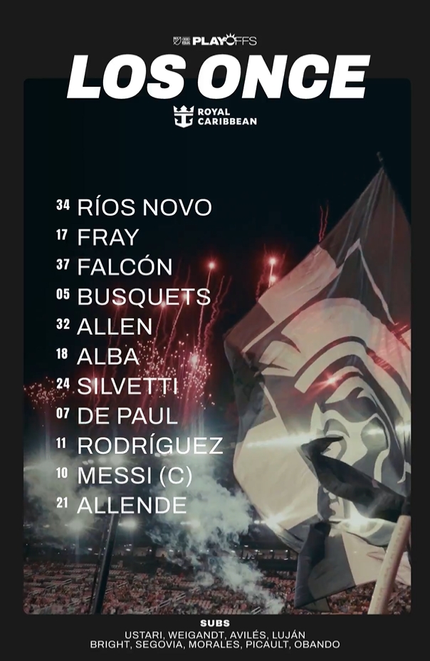 迈阿密国际首发:34-诺沃、17-伊安·弗雷、37-法尔肯、32-阿伦、18-阿尔巴、21-阿连德、7-德保罗、5-布斯克茨、10-梅西、11-B·罗德里格斯、24-西尔维蒂