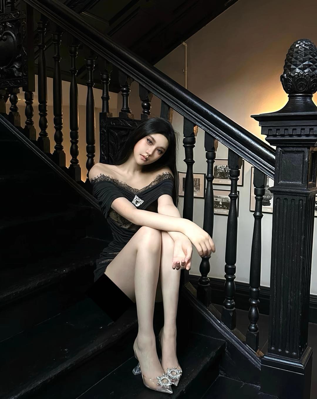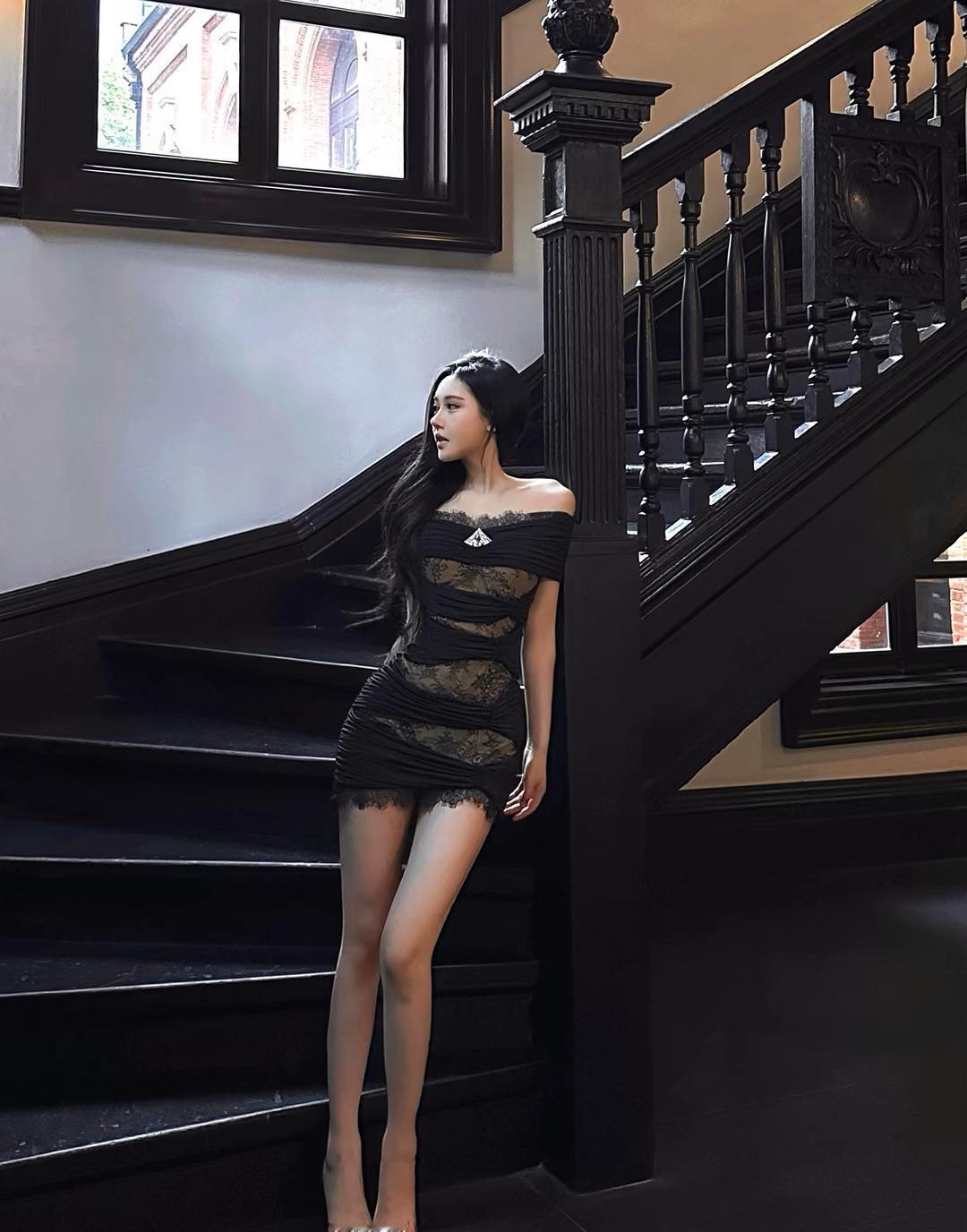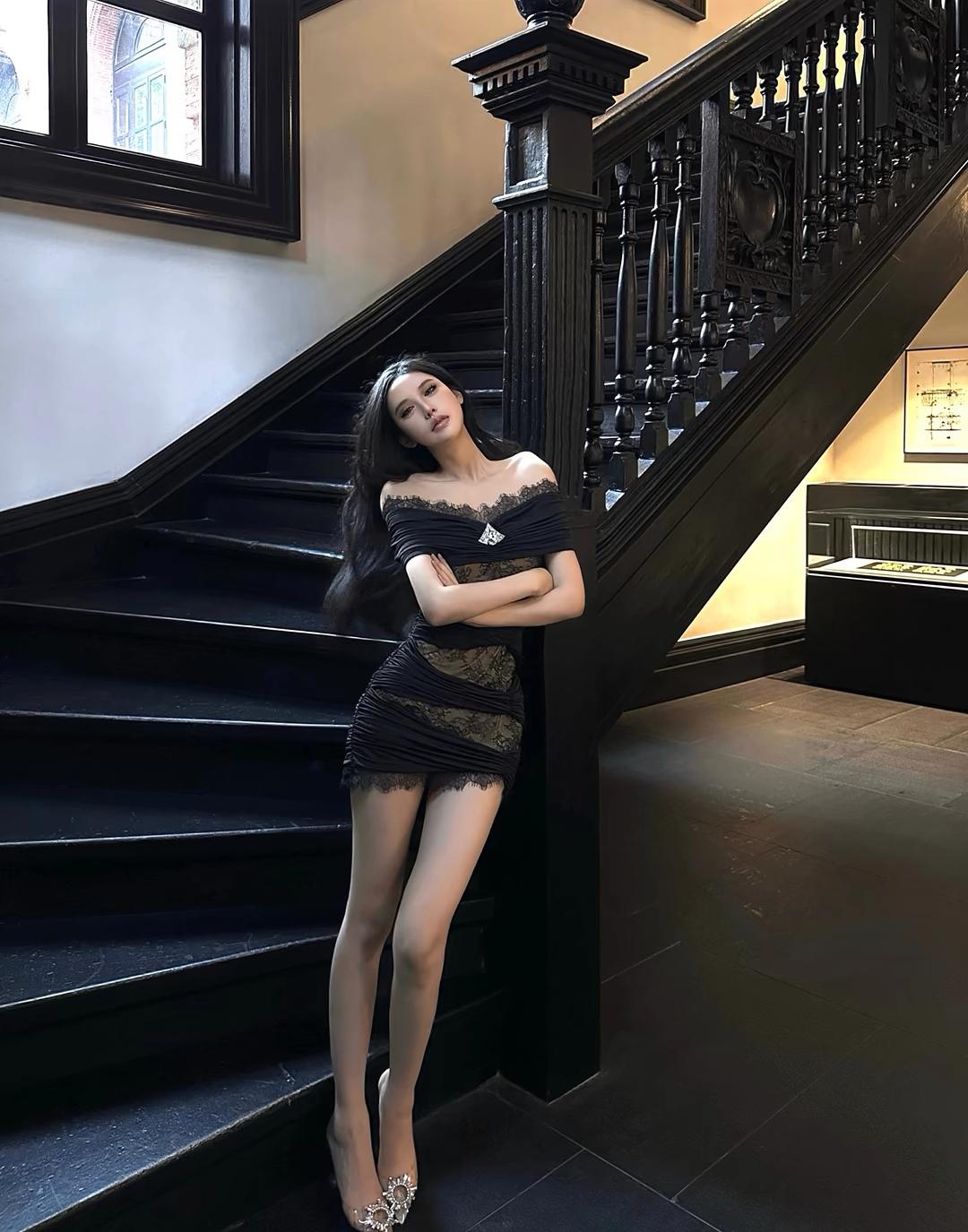 优雅黑裙少女,静坐古朴楼梯,尽显复古韵味。