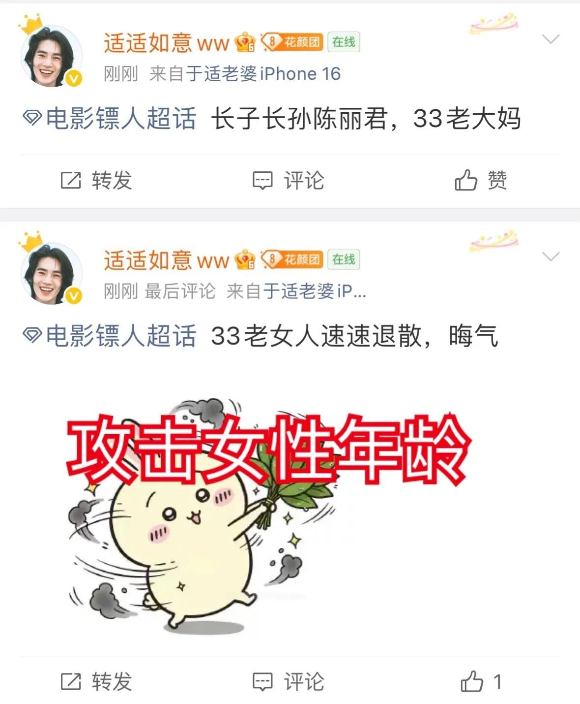 一早起来,发现于适和陈丽君粉丝撕得越来越厉害了! 事情起源于电影《镖人》上电影推介会,上面的排名顺序是吴京、谢霆锋、李连杰、陈丽君、于适(图一)…… 然后这下惹了马蜂窝。要知道在杀青时,官方的排位李连杰之后可是于适(图二)! 于适粉丝直接点名“越剧女”,说陈丽君买了营销号……而更猛的是,竟然有于适粉丝对陈丽君年龄发起了攻击,说她“长子长孙,33岁陈丽君”,“33岁老女人,速退,晦气”等! 说实话,我是无法理解这种“抢排位”的行为的。 第一,排在前面,就说明咖位大?就说名气大?就说明演技好?好不好,在观众看后的感受吧?你看李连杰排第三,他说了什么吗? 第二,每个人的咖位都是慢慢长大的。你今天排第五,自己努力,过几年排第三,何必去争呢?你真有本事,别人自然会给你排前面。你看吴京排第一,有人提出了意见吗?没有啊!因为无可撼动。如果有争议,说明实力不够!