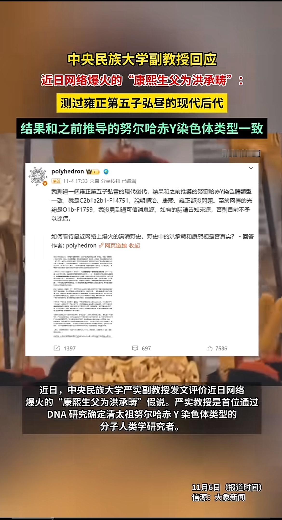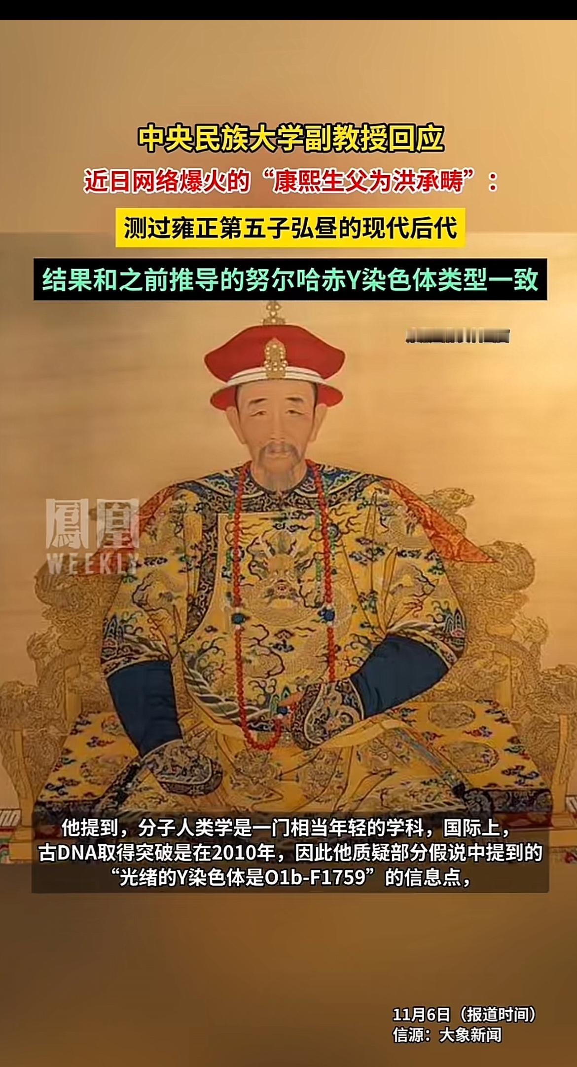 网上突然疯传“康熙生父是洪承畴”,这传言也太离谱了。洪承畴虽是明末清初政治、军事人物,康熙还追赠他少师,赐谥号“文襄”,但这也不能瞎编身世啊。 中央民族大学严实副教授亲自下场回应。他是首位通过DNA研究确定清太祖努尔哈赤Y染色体类型的研究者。2019年他采样过雍正第五子和恭亲王弘昼的后代,结果显示他们来自努尔哈赤C2b1a2b1 - F14751支系,说明努尔哈赤、康熙、雍正、弘昼是相同父系。而且分子人类学采样严谨,不像商业测试靠自填祖源信息。这“康熙生父是洪承畴”的说法,纯属无稽之谈。