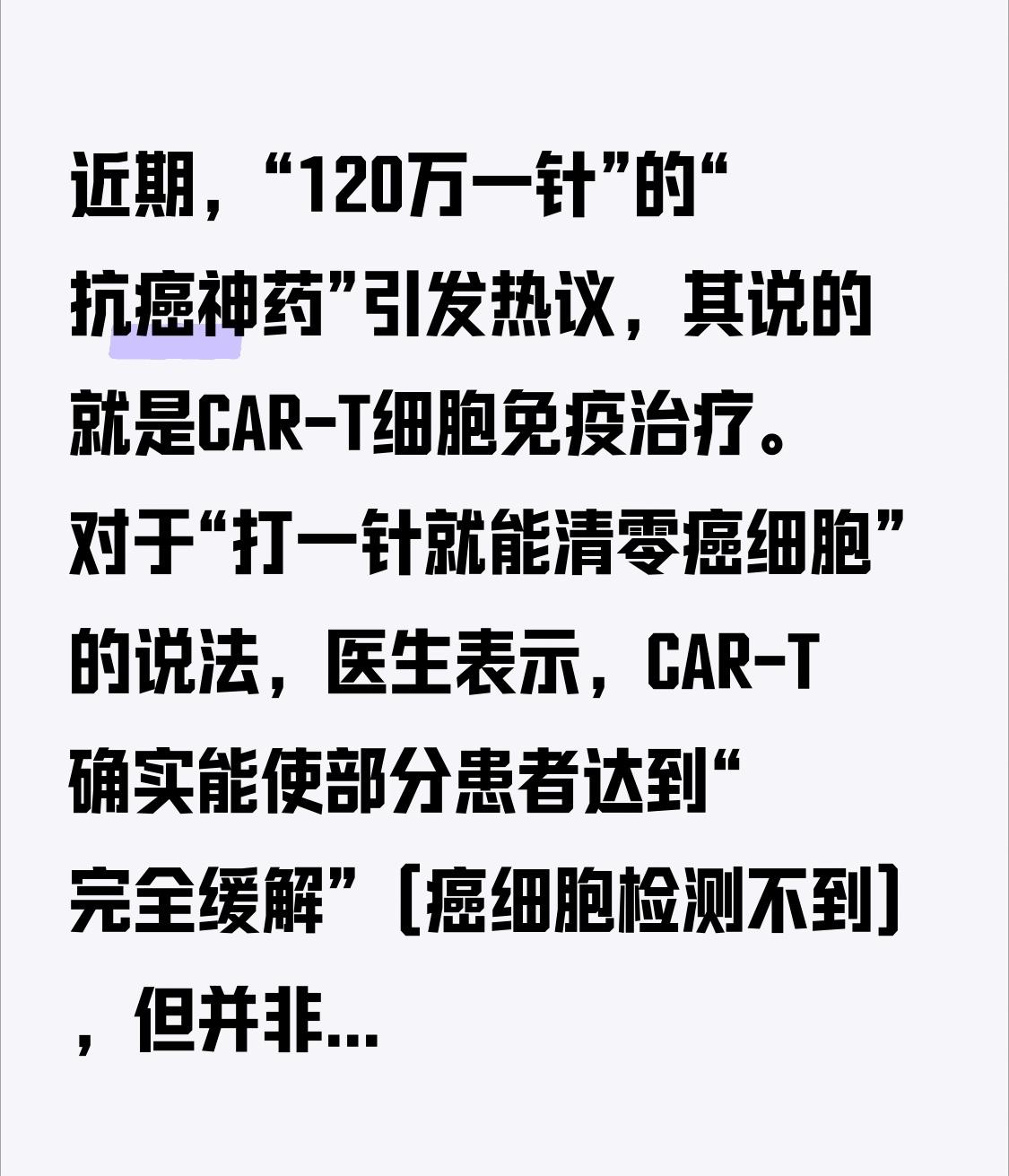 近期,号称“120万一针”的“抗癌神药”掀起了热议狂潮,它就是CAR-T细胞免疫治疗,就像一颗投入舆论池塘的巨石,激起层层浪花。对于“打一针就能清零癌细胞”这一说法,医生幽默地泼了盆冷水,CAR-T确实能让部分患者达到“完全缓解”(癌细胞检测不到),不过它可不是万能的魔法针,并非100%有效。