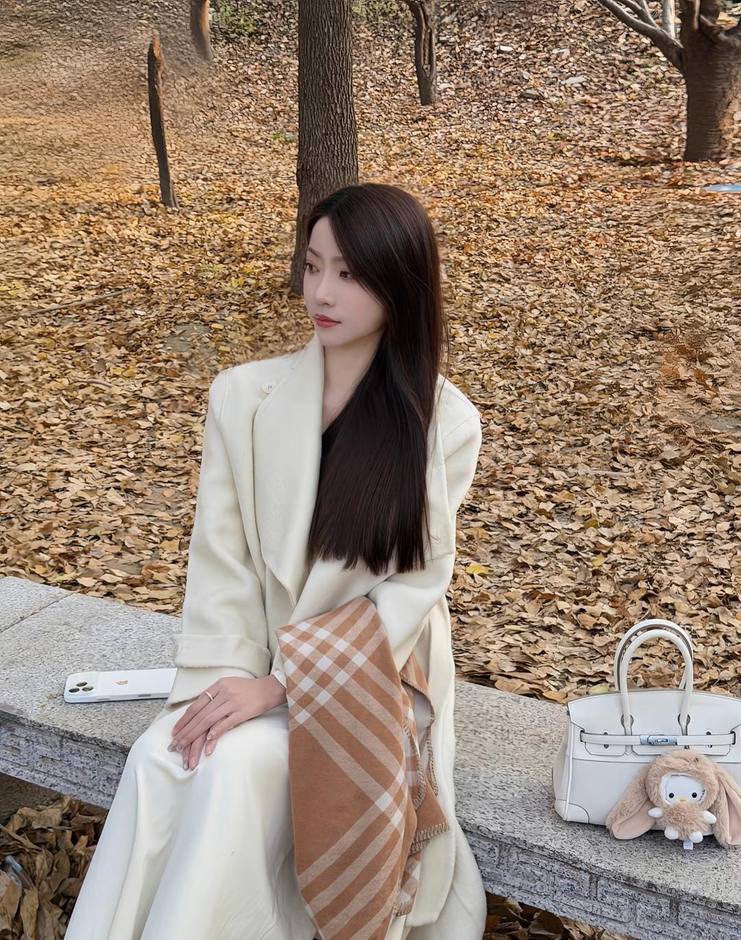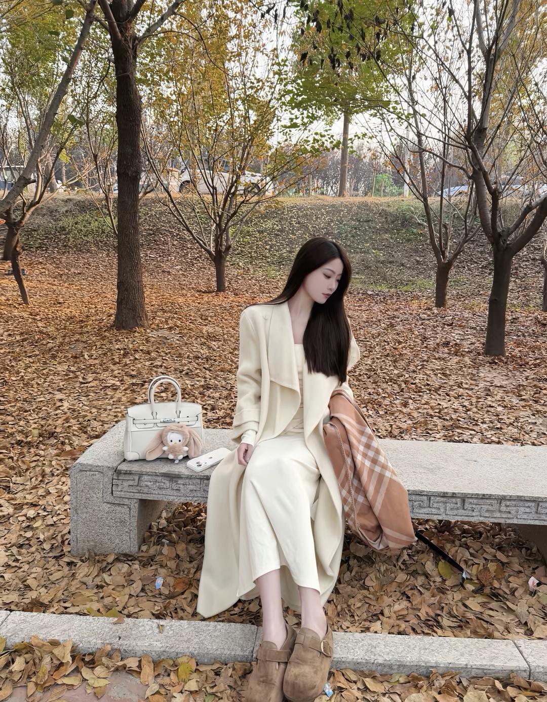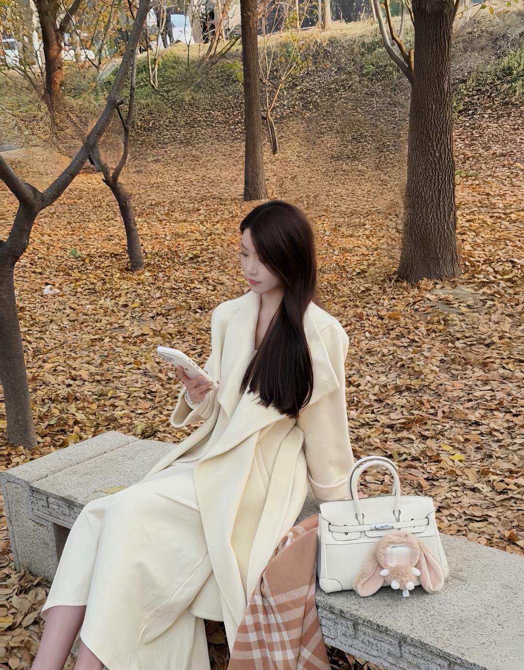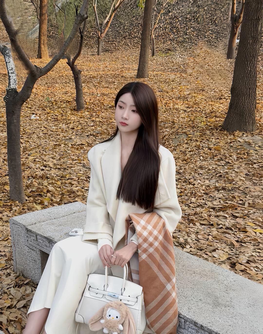 秋日暖阳下,优雅的白色套装与毛绒小兔子包,尽显温柔与时尚。