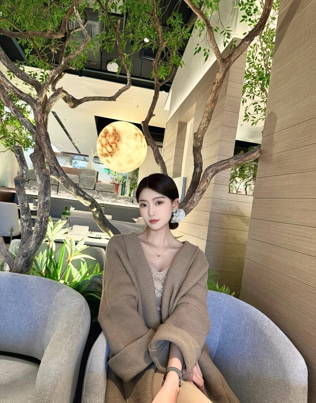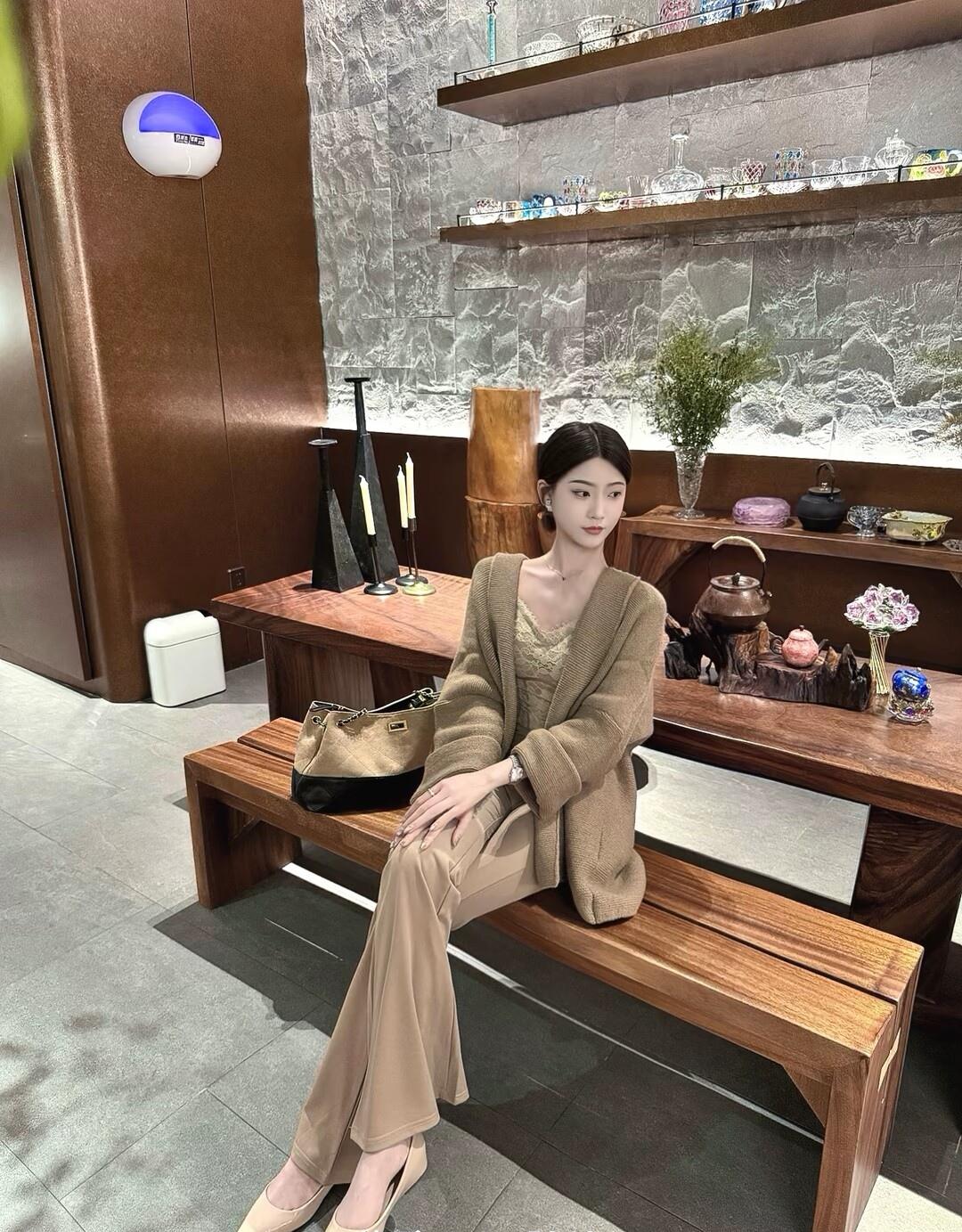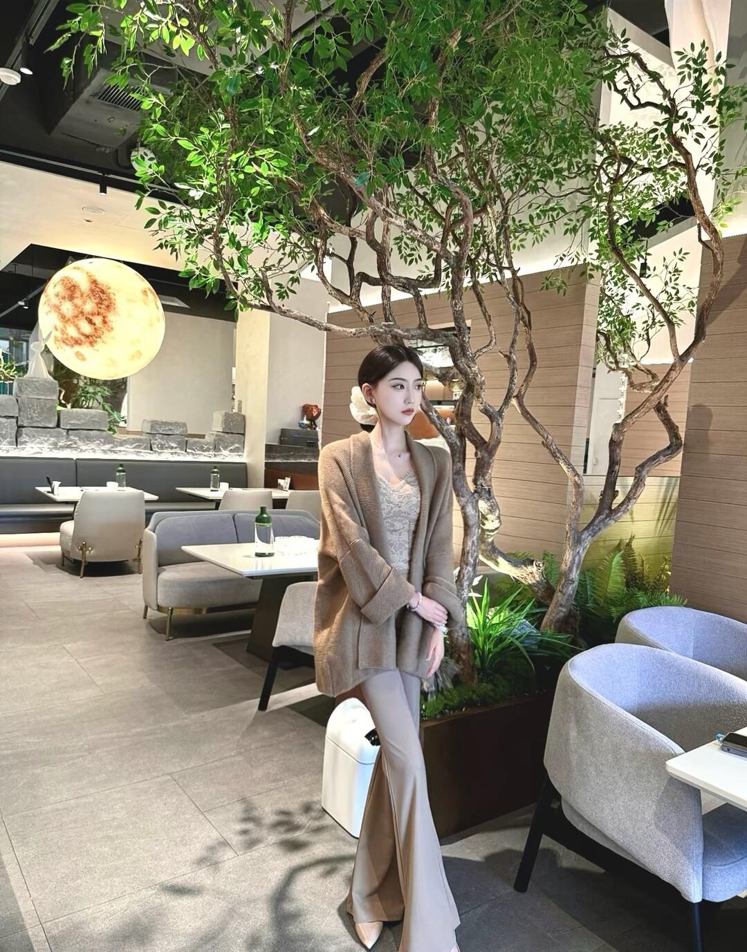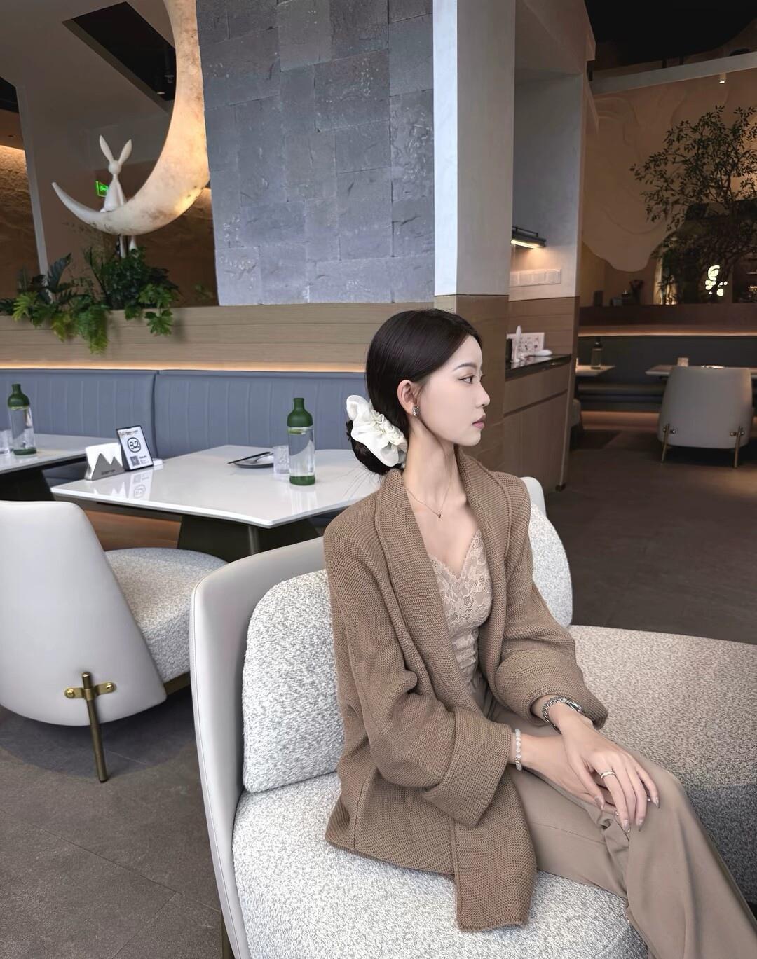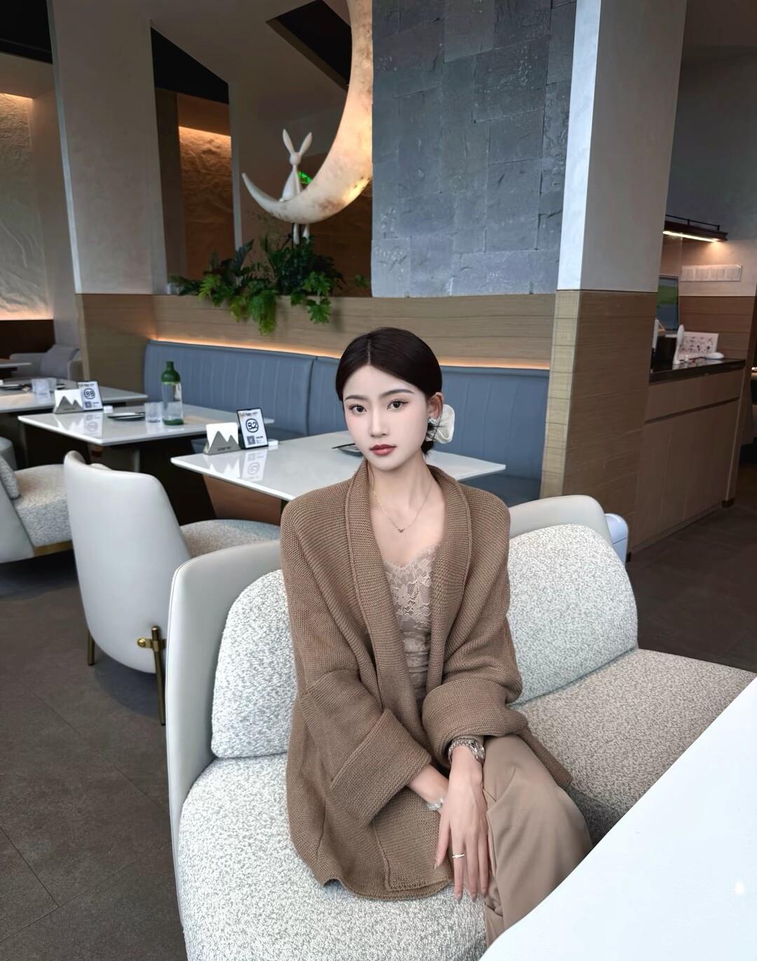 优雅气质穿搭,浅棕色针织外套搭配蕾丝上衣,尽显温柔魅力。