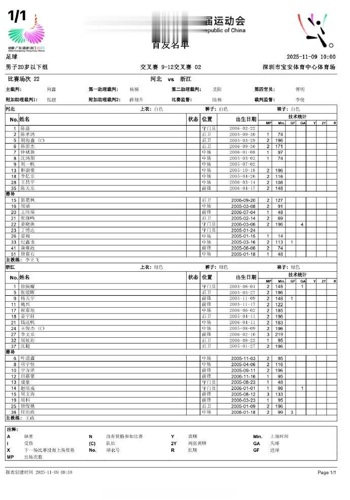 在今天上午进行U20全运会9-12名排位赛比赛中,浙江队赛前公布的首发名单中,王钰栋确实缺席比赛名单当中。