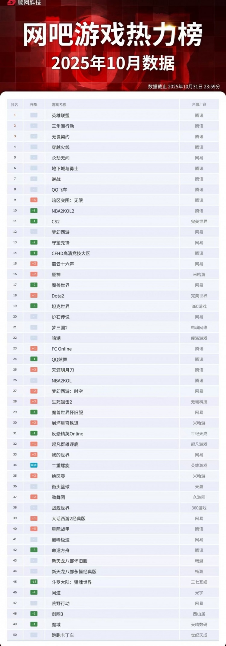 网吧游戏10月热力榜:英雄联盟依旧是最火热 三角洲行动位列第二