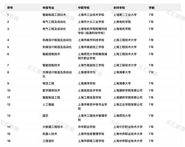 记者从市教委职教处获悉,上海海事大学首次加入中本贯通培养行列,与上海港湾学校共同开设机械设计制造及其自动化、物流工程2个专业点;上海师范大学与上海市工程技术管理学校贯通开设园艺专业点;上海第二工业大学、上海工程技术大学、上海电机学院3所公办院校均将与中职校共同开展职业本科的贯通培养。