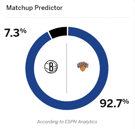 ESPN预测明日尼克斯vs篮网比赛:尼克斯胜率高达92.7%