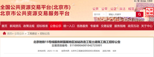 此次加站改造工程已获北京市发改委批准,由北京城市快轨建设管理有限公司负责招标。本次招标内容涵盖土建工程、安装工程等核心环节,为项目后续快速推进奠定基础。