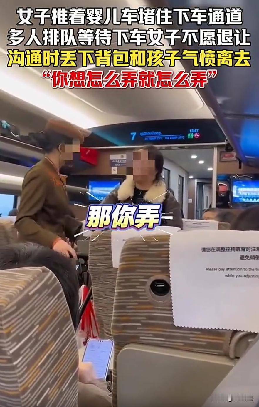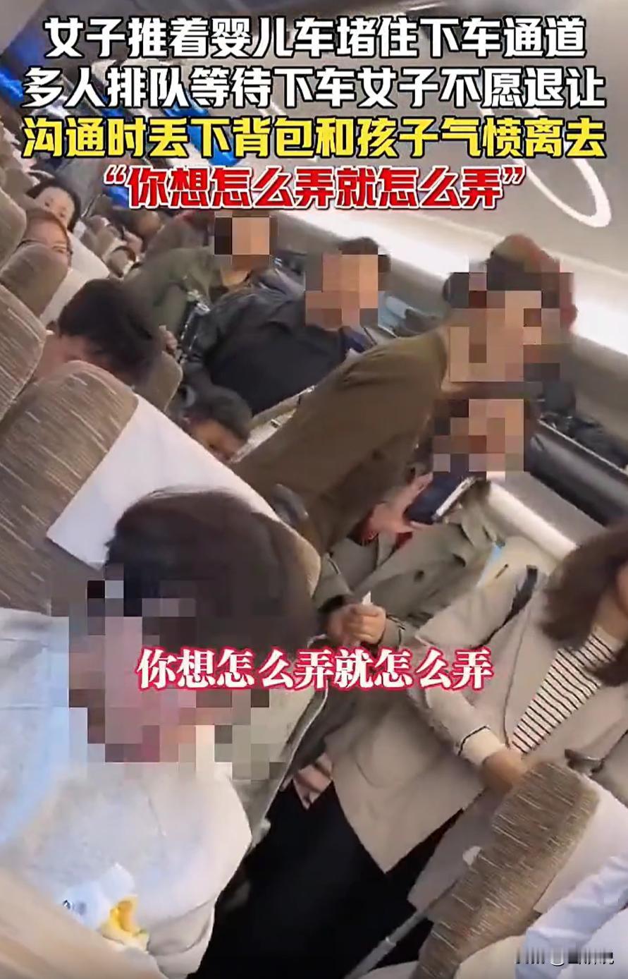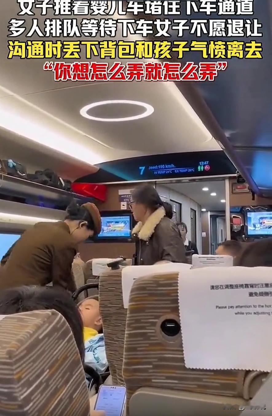 高铁到站后,一女子并没有下车,反倒是推着婴儿车堵在过道,以孩子需要休息为由拒绝让道,导致一排要下车的乘客堵在了车厢中,列车员上前调解,女子竟然耍起脾气,弃下婴儿车转身就走 视频中,女子的年纪并不大,推着婴儿车堵在过道上,后面一长排人全被困在原地,急着赶车的、提着行李的、带孩子的,全都只能干等。有人小声提醒该下车了,她却头也不回地说,孩子在睡觉,不能动 这话一出,后面几位乘客都有些着急。有人好言相劝,说只要往旁边挪一点点,大家侧身就能过去。可她像是没听见,依然稳稳站在原地 两名列车员很快赶了过来。他们语气温和,商量着能否把婴儿车往后移半米,让出一条通道。没想到这一劝,反而激怒了她 我弄不了,你弄吧。她突然提高音量,对着列车员连说好几遍。接着做出一个让人意外的举动,把肩上的背包往车上一放,转身就走,直接把婴儿车和孩子留在了原地 车厢里的人都愣住了。列车员反应很快,一人推着婴儿车,一人在旁边护着,小心地把车推到旁边空地处。被堵住的乘客这才得以通过 有网友说:虽然堵路不对,但也应该考虑女子的困处,婴儿车确实没地方放 客观来说,婴儿车不好挪,空间又小,带孩子本来就不容易。但这话其实经不起推敲。带娃辛苦没错,可那不是可以为所欲为的理由。高铁的过道不是婴儿车的停车位,也不是私人空间,哪怕车再挤,也不能让所有人跟着你为难 公共场所里,每个人都有自己的不方便,但大家能顺利相处,全靠互相体谅。有人行李多、有人年纪大、有人抱着孩子,但都知道不能占着过道耍性子。如果每个人都用“我也有难处”当借口,那车厢迟早乱成一锅粥 如果因为自己的不便,就让整列车厢的乘客都无法正常通行,这样的坚持是否已经超出了合理的范围?
