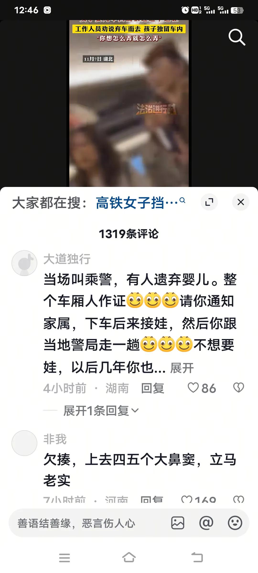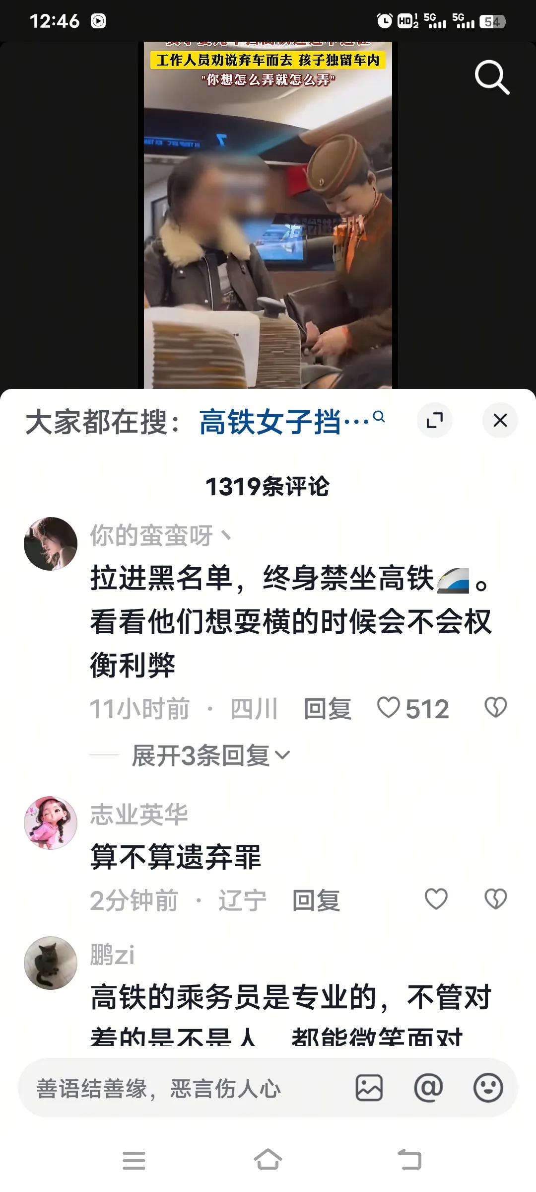 11月7日,武汉到北京的G72号高铁上发生了离谱一幕。一女子推婴儿车堵着过道,说孩子要休息不肯退让。乘务员好声好气沟通,女子态度蛮横,让乘务员“自己解决”“想怎么弄就怎么弄”。 更绝的是,她把背包放婴儿车上,自己转身就走,留下孩子在车里。这行为太不负责任了,既耽误其他乘客下车,还不顾孩子安危。12306回应可向乘务员、列车长和乘警反映。出门在外,还是多点公德心,别这么任性。 这件事情引起网友的愤怒,有人说直接拉黑永远也不让她再坐高铁。也有人说当场叫乘警,有人弃婴儿等各种看法。高铁中尴尬瞬间 高铁恶心行为 高铁恶心行为 高铁离谱事件