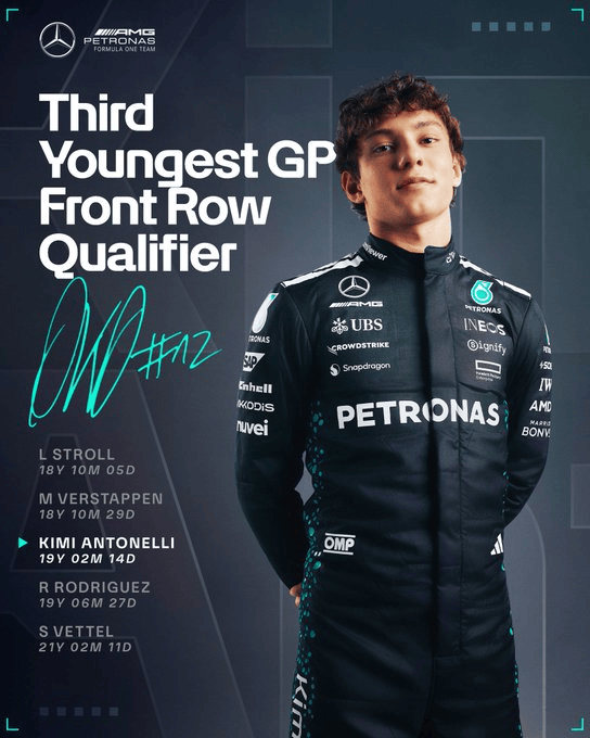 虎扑11月09日讯在F1圣保罗大奖赛排位赛中,基米-安东内利表现优异排名第二,他以19岁零76天的年龄成为大奖赛前排发车的历史第三年轻车手,仅次兰斯-斯托尔和马克斯-维斯塔潘。