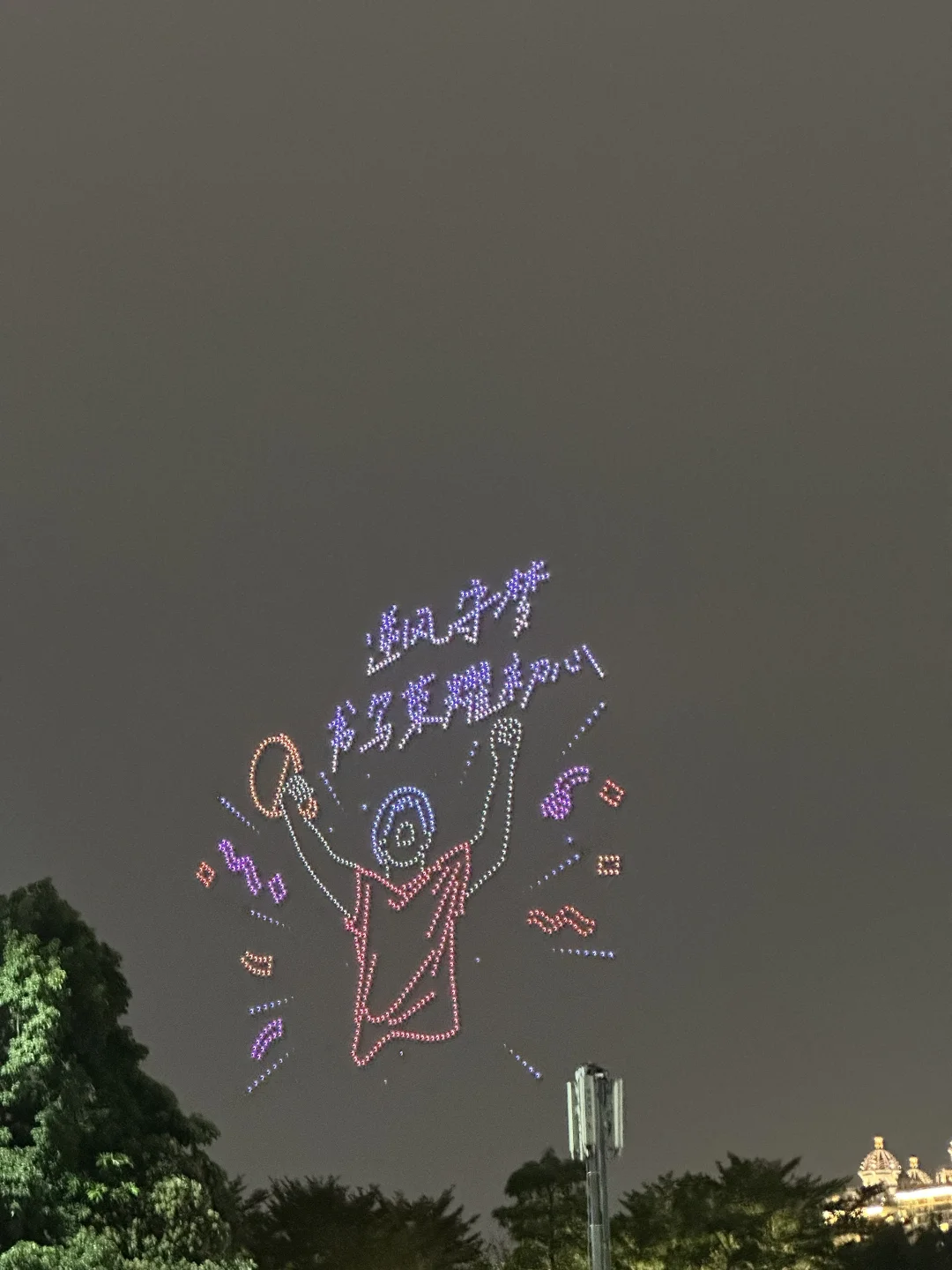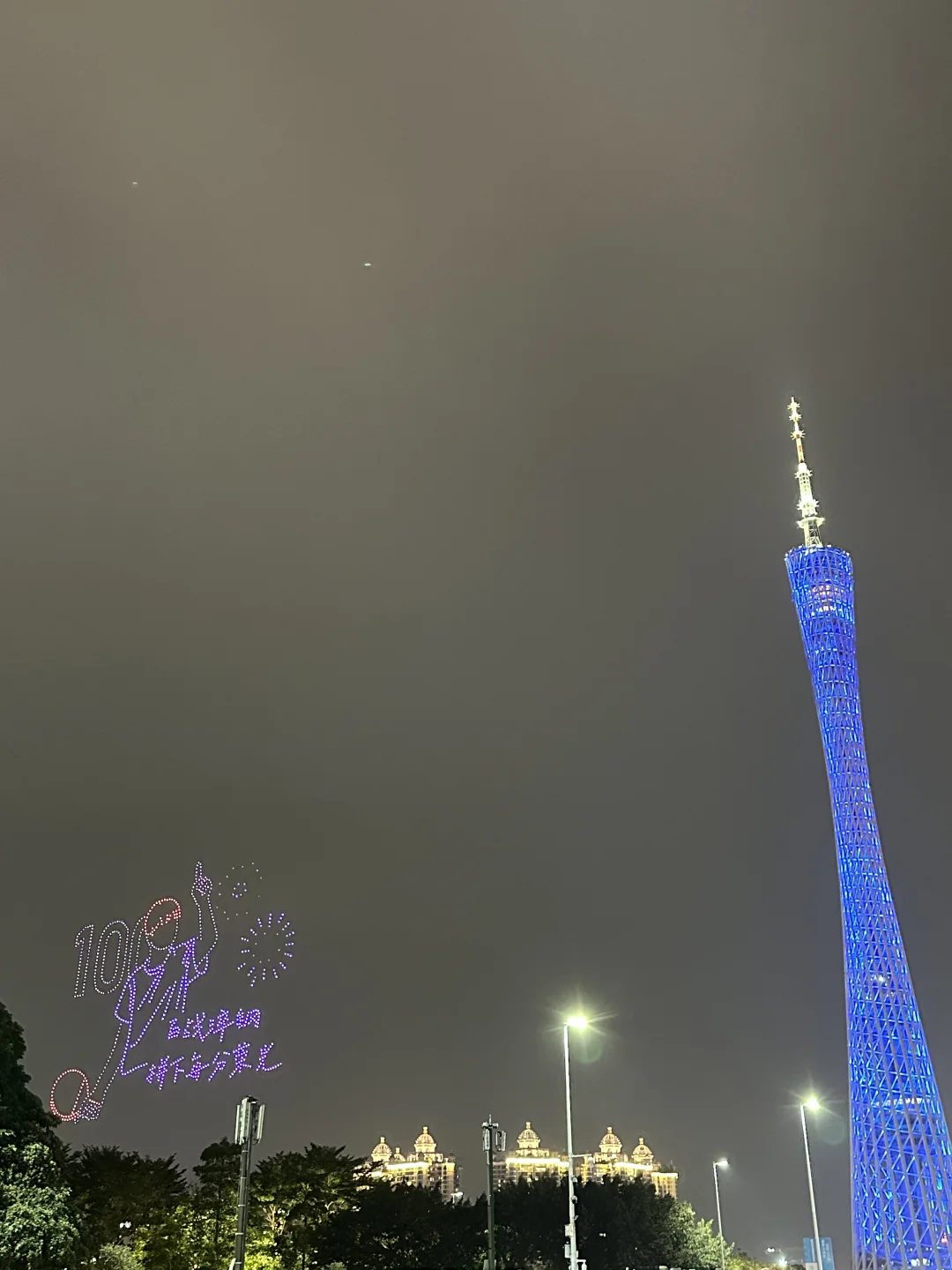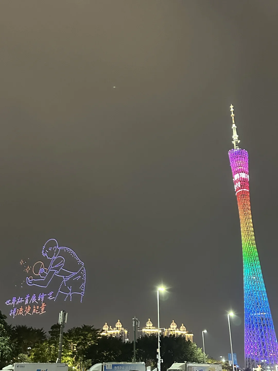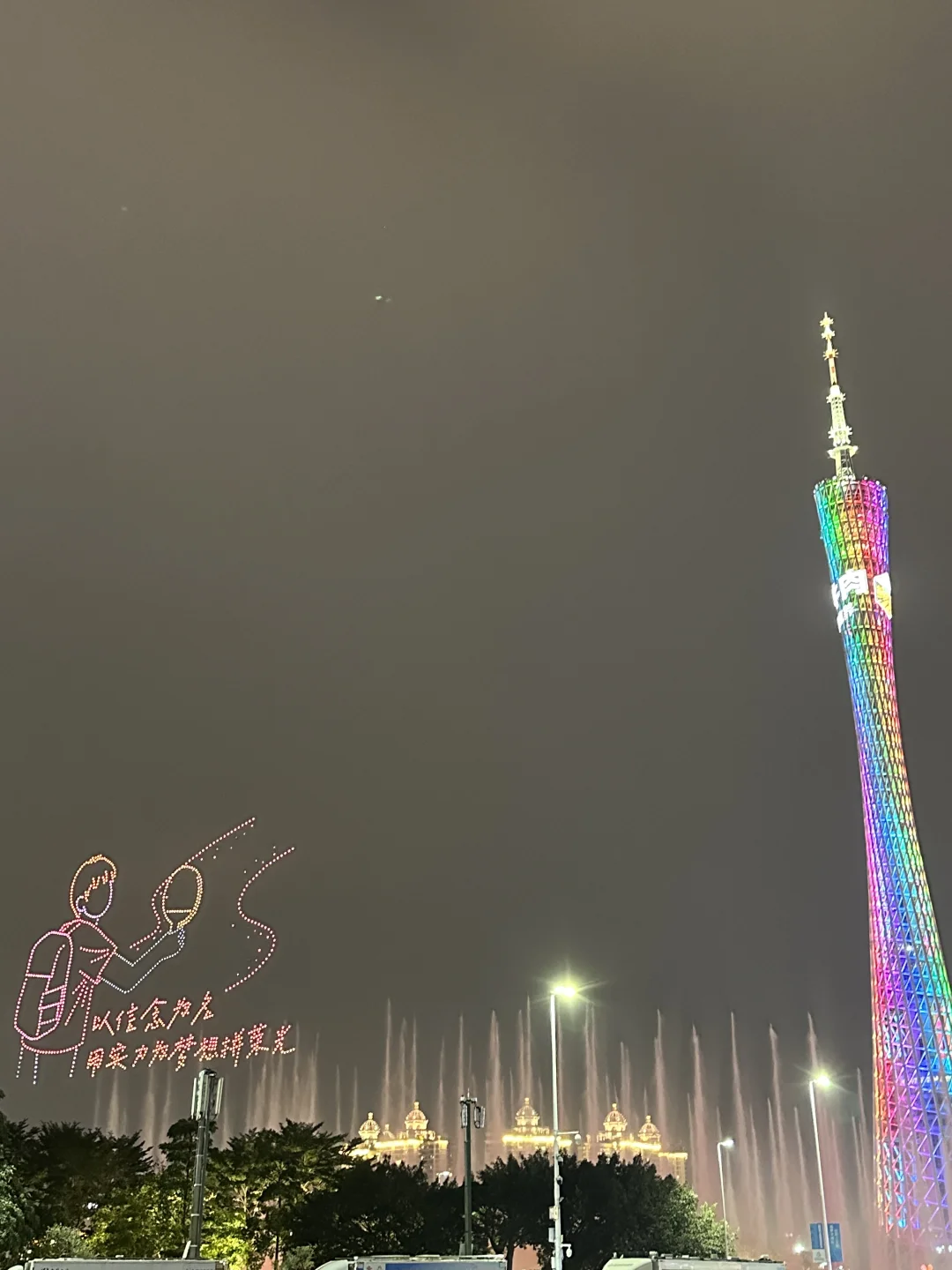 当广州塔换上了低饱和度色系 先上干货路线:地铁APM线大剧院站E口出,别绕地面!地下通道直通花城汇中区,避开晚高峰车流,5分钟就能摸到核心拍景区,还没到就听见球迷的小声欢呼,连赶路的疲惫都被期待感冲没了~ 必拍机位:海心沙看台中层(全景C位) 别傻挤下层!中层视野刚好,能同时装下无人机编队、广州塔、全运会主题灯带。最绝的是无人机拼成孙颖莎挥拍图案时,广州塔刚好亮着暖金全运灯光,背景是CBD的亮灯楼群,层次感直接拉满。拍的时候记得开手机连拍(划重点!),无人机图案切换太快,连拍能抓下“运动感+夜景感”同框的瞬间,我蹲了2场,终于拍到“挥拍剪影+广州塔尖”的绝景,直接设成电脑壁纸了~ 必拍机位:花城广场北塔旁草坪(低空细节位) 这地方很少人抢!草坪斜坡能稍微抬高视角,无人机低空飞行时,能拍到机身灯光和地面全运灯带的光斑重叠,像漫天星星落在CBD。晚上9点后人流变少,能独占这个角度,把镜头对准无人机编队的边缘,让广州塔作为背景虚化,突出“空中文字”的细节,红金配色的应援字样在蓝黑夜空里超显眼,不用加滤镜就有电影感。 • 避开周末晚上8点的旅行团高峰,工作日晚上或周日去,拍的时候不用躲人头。
