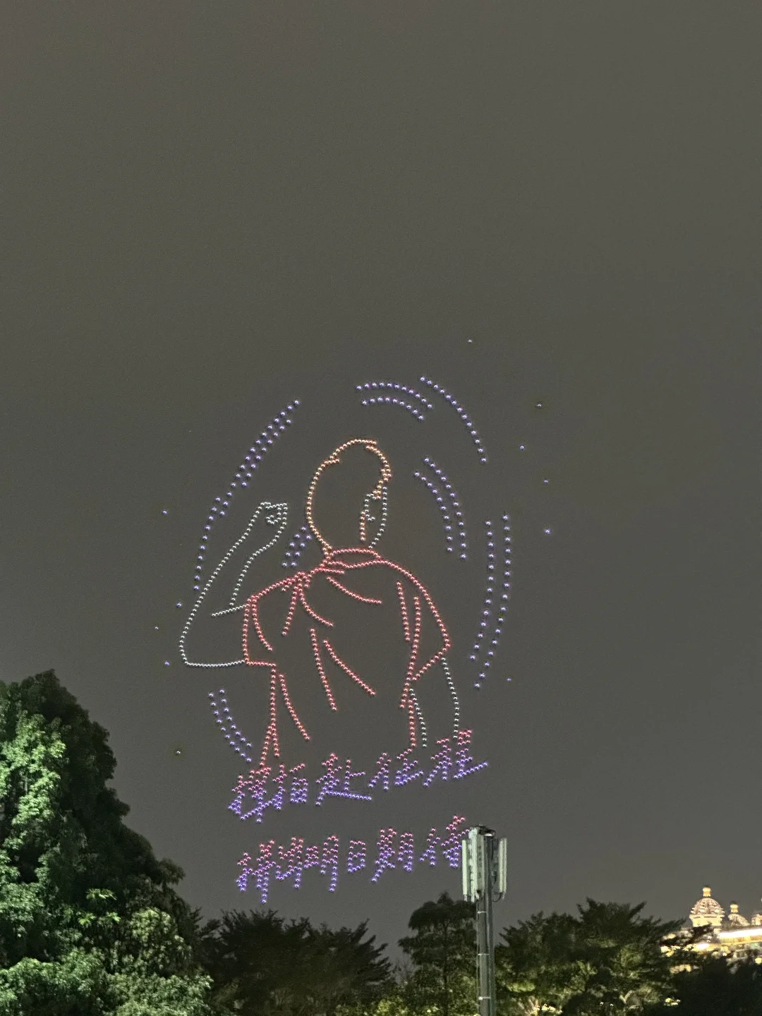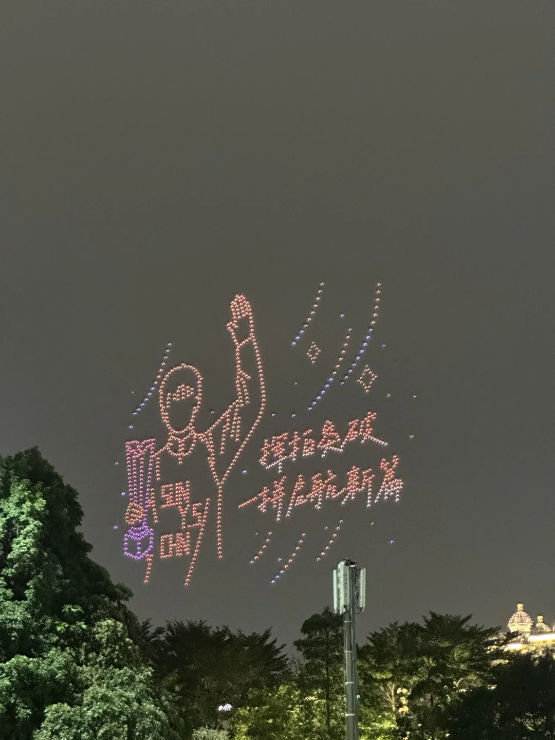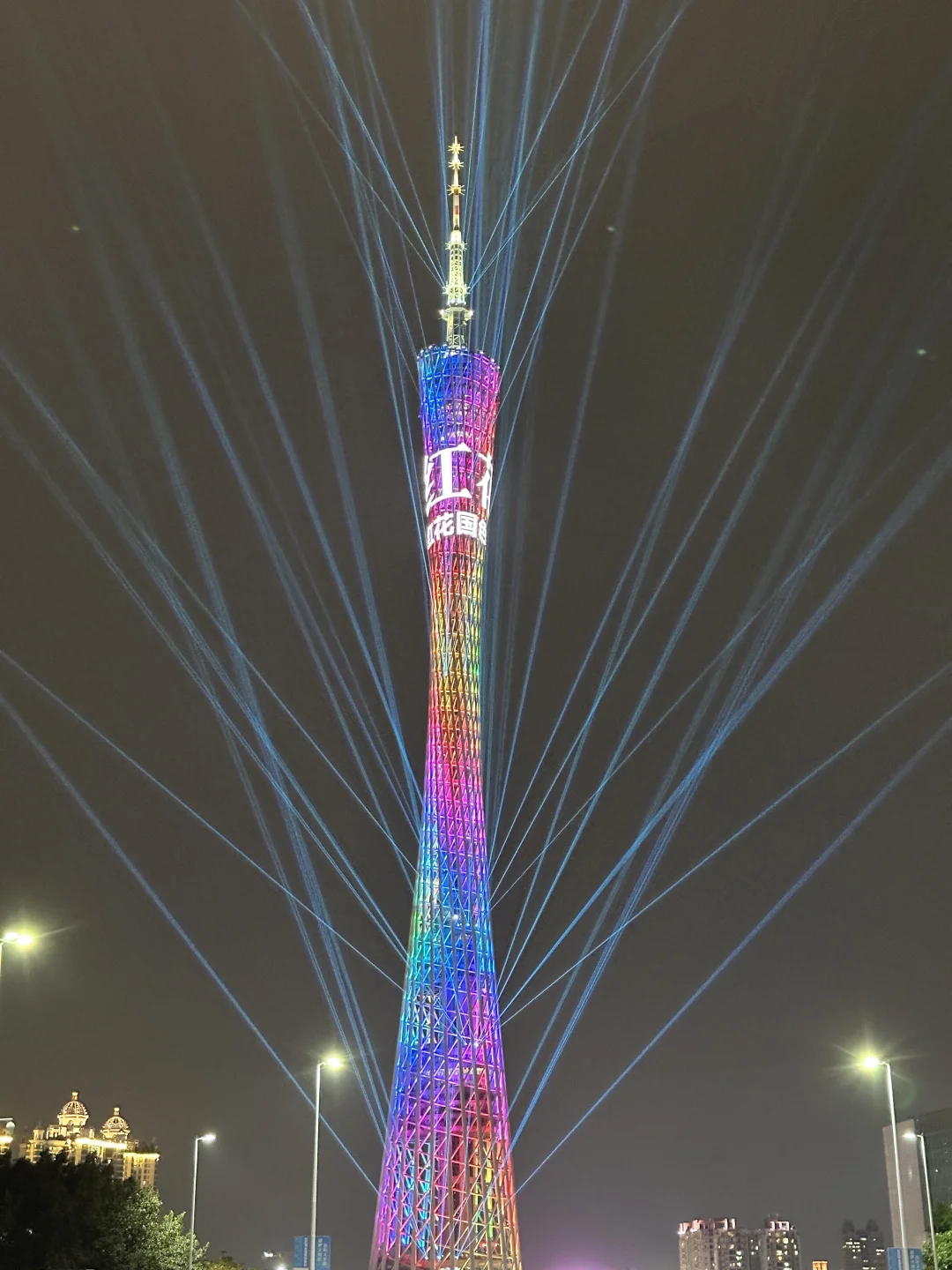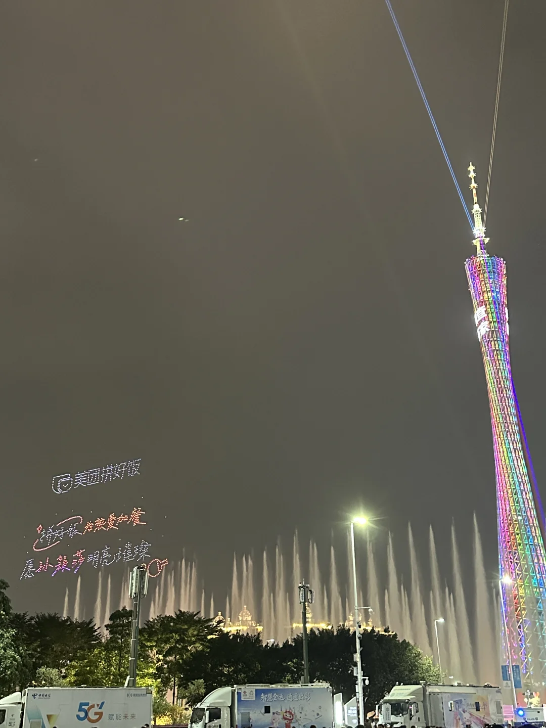 当广州塔换上了低饱和度色系 先上干货路线:地铁APM线大剧院站E口出,别绕地面!地下通道直通花城汇中区,避开晚高峰车流,5分钟就能摸到核心拍景区,还没到就听见球迷的小声欢呼,连赶路的疲惫都被期待感冲没了~ 必拍机位:海心沙看台中层(全景C位) 别傻挤下层!中层视野刚好,能同时装下无人机编队、广州塔、全运会主题灯带。最绝的是无人机拼成孙颖莎挥拍图案时,广州塔刚好亮着暖金全运灯光,背景是CBD的亮灯楼群,层次感直接拉满。拍的时候记得开手机连拍(划重点!),无人机图案切换太快,连拍能抓下“运动感+夜景感”同框的瞬间,我蹲了2场,终于拍到“挥拍剪影+广州塔尖”的绝景,直接设成电脑壁纸了~ 必拍机位:花城广场北塔旁草坪(低空细节位) 这地方很少人抢!草坪斜坡能稍微抬高视角,无人机低空飞行时,能拍到机身灯光和地面全运灯带的光斑重叠,像漫天星星落在CBD。晚上9点后人流变少,能独占这个角度,把镜头对准无人机编队的边缘,让广州塔作为背景虚化,突出“空中文字”的细节,红金配色的应援字样在蓝黑夜空里超显眼,不用加滤镜就有电影感。 • 避开周末晚上8点的旅行团高峰,工作日晚上或周日去,拍的时候不用躲人头。