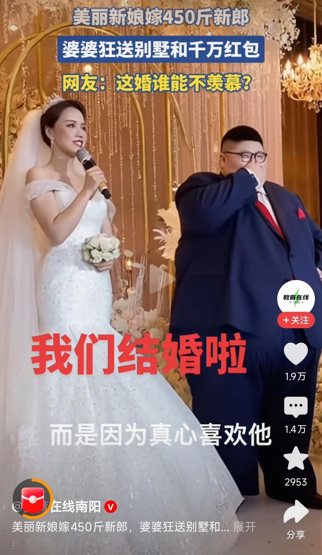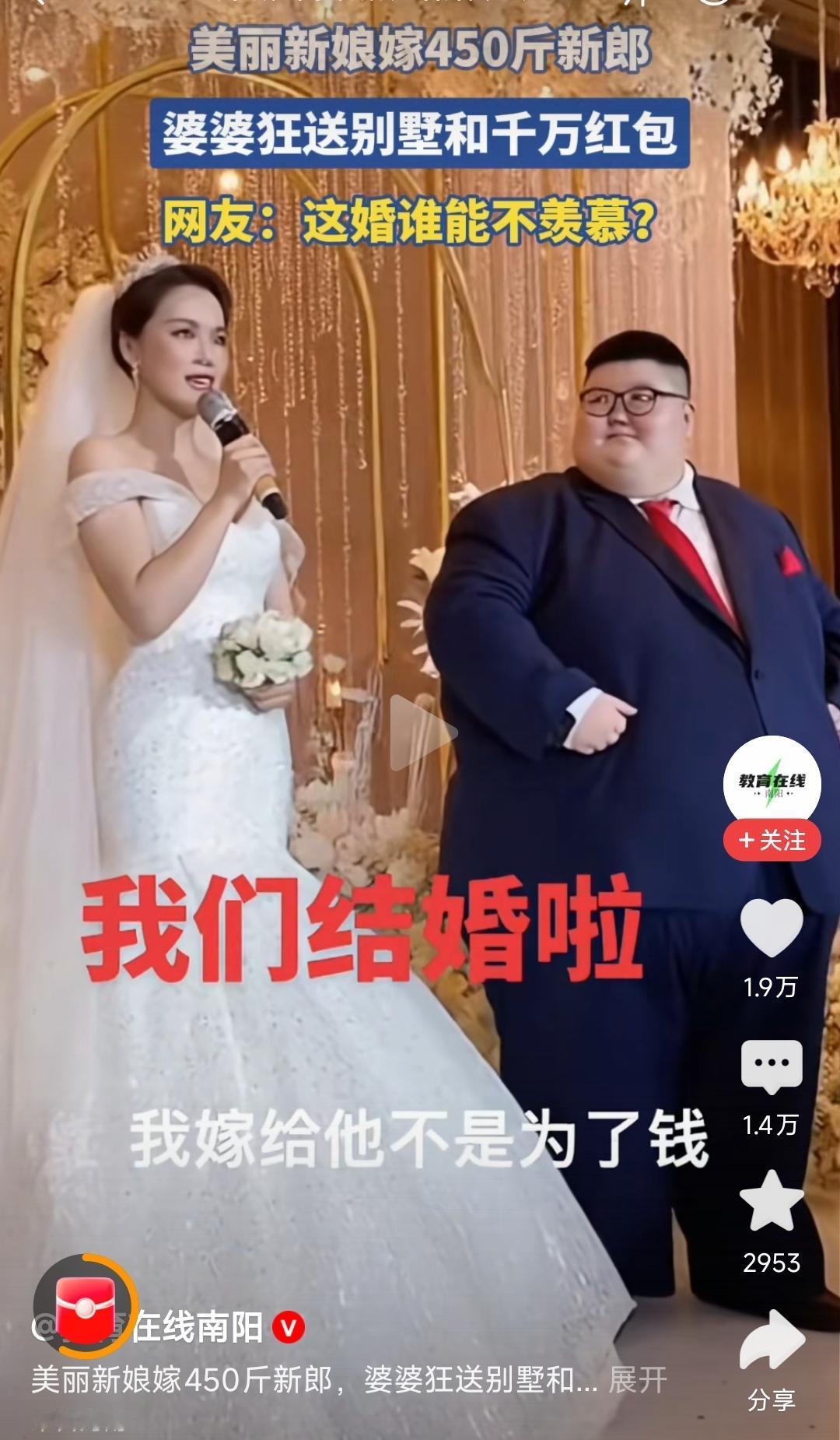 美女嫁给450斤大胖子,婚礼发言:我嫁给他不是为了钱,是真心喜欢他…… 然后,跟了一句:也谢谢公公婆婆送的别墅和1000万的大红包[黑线] 真佩服这个女人说这种话,彻底相信了这是真爱了。 大家就别怀疑了:男的不为钱,女的不好色! 真的,这才是人世间最真挚的感情[捂脸][捂脸]
